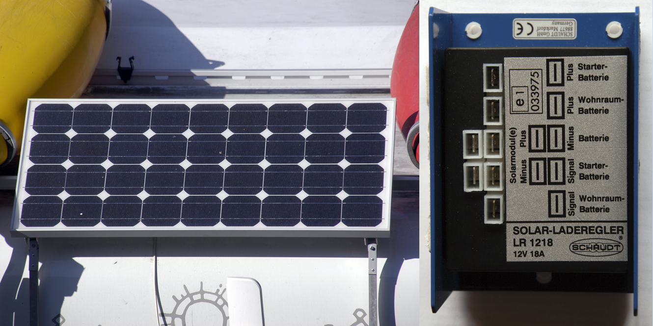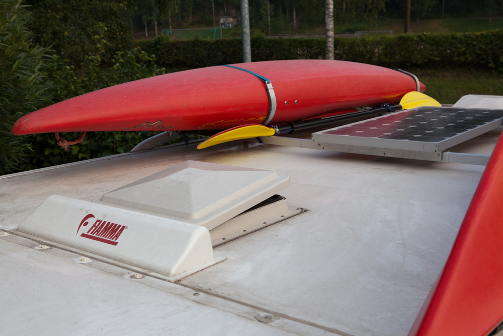 Kattotelineissä on kesäkäyttöön kahdet kaaret kajakeille. Keskelle kattoa kiinnitettiin 70 Watin aurinkokenno, joka lataa 100 Ampeeritunnin akkua. 1000 Wattisen invertterin kautta sähköä saadaan TV:lle, läppärille ja kamera-akun laturille. Kenno on edellisestä autosta. Siinä se oli katon peräosassa kallistettavassa telineessä. Suuntaaminen kohti aurinkoa lisää lataustehoa selvästi. Vaakasuorassa oleva kennokin lataa kesäaikaan riittävästi. Kallistuvaa telinettä helpompi olisi asentaa katolle kaksi kennoa.