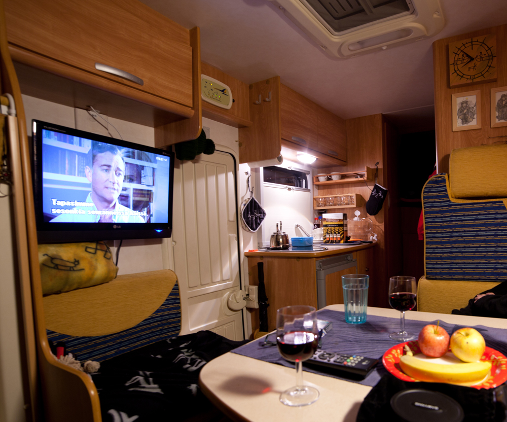 Talvella illat ovat pitkiä ja ajanlukua kaivataan. Taulu-TV asennettiin oikealle seinälle, pikkusohvan yläpuolelle. Auton ainoa pistorasia oli keittiössä. Pistorasian johdot kulkivat seinän takana vaatekaapista. Niistä haaroitettiin kaksi uutta linjaa. Toinen vedettiin yläkaappien kautta eteen. Siitä saadaan virtaa TV:lle ja esimerkiksi läppärille, silloin kun tehdään töitä olohuoneen pöydän ääressä. Toinen linja vedettiin takatalliin. Täällä siitä saadaan sähköä työkaluille tai vaikkapa suksien voiteluun. Harvemminkäytetty mikroaaltouuni on myös takatallissa omalla hyllyllään.
