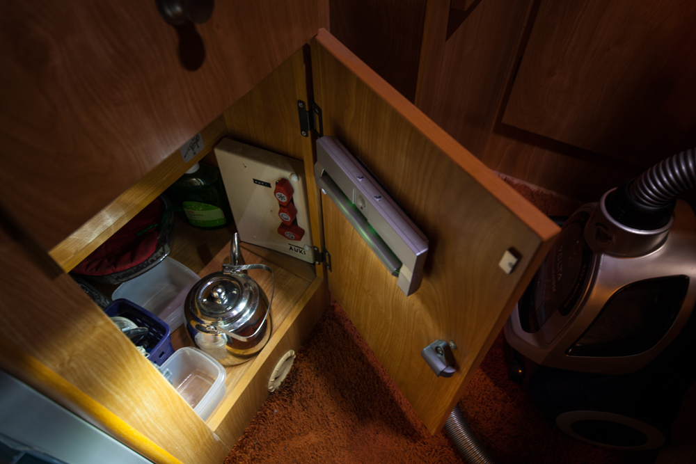 Takaseinällä oli luukku takatalliin. Luukulla ei tuntunut olevan juuri käyttöä. Luukun kohdalle tehtiin keittiökaappi kolmella hyllyllä. Tämä kaappi valaistiin pienillä paristokäyttöisillä led-valaisimilla. Valot sammuvat oveen liimatuilla magneettikytkimillä.