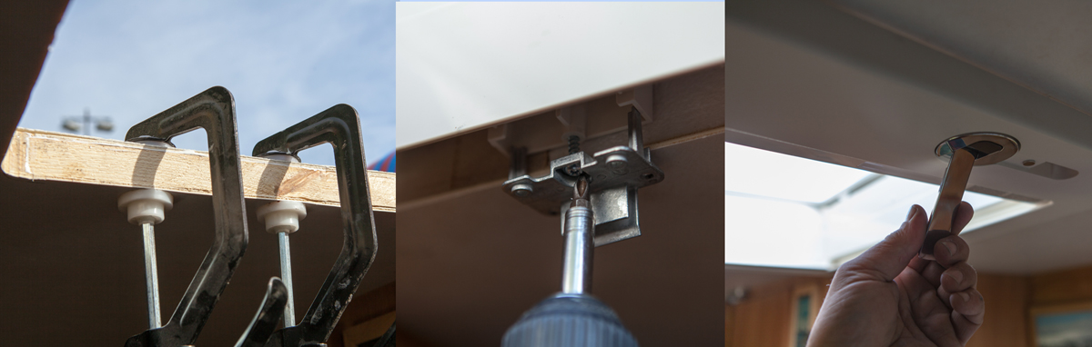 Kattoluukku oli melko umpinainen ja se vaihdettiin. Alkuperäistä aukkoa suurennettiin Dometicin kattoikkunaa varten. Eristettä poistettiin uuden aukon reunoilta ja kattolevyjen väliin liimattiin puurimat tueksi. Dometicin ikkunan ei aiheuta vuotokohtia kattoon, koska kiinnityksessä ei tarvitse porata katoon reikiä. Luukun kehys puristetaan sisäpuolelta kiin kattoon. Välii runsaasti butyylimassaa. Uusi kattokkuna aukeaa veivillä.