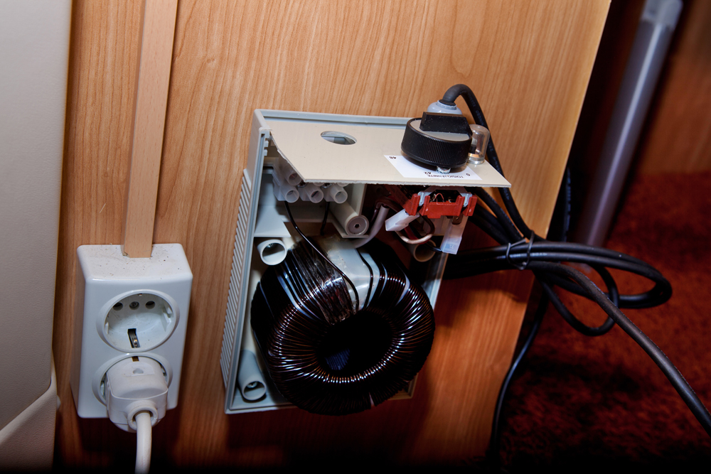Talvella illat ovat pitkiä ja ajanlukua kaivataan. Taulu-TV asennettiin oikealle  seinälle, pikkusohvan yläpuolelle. Auton ainoa pistorasia oli keittiössä. Pistorasian johdot kulkivat seinän takana vaatekaapista. Niistä haaroitettiin kaksi uutta linjaa. Toinen vedettiin yläkaappien kautta eteen. Siitä saadaan virtaa TV:lle ja esimerkiksi läppärille, silloin kun tehdään töitä olohuoneen pöydän ääressä. Toinen linja vedettiin takatalliin. Täällä siitä saadaan sähköä työkaluille tai vaikkapa suksien voiteluun. Harvemminkäytetty mikroaaltouuni on myös takatallissa omalla hyllyllään.