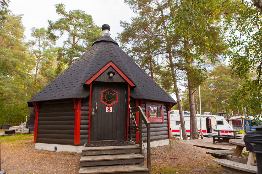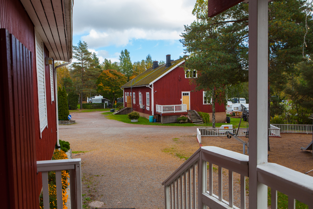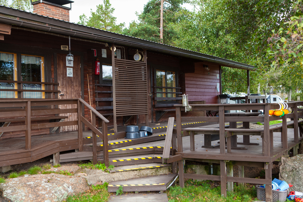 Kallion päällä lähellä porttia, pienen matkan päässä rannasta on suurempi rakennus. Sieltä löytyy vessat, suihkut sekä keittiötilat ympärivuotiseen käyttöön ja kokoontumistilat karavaanareille.