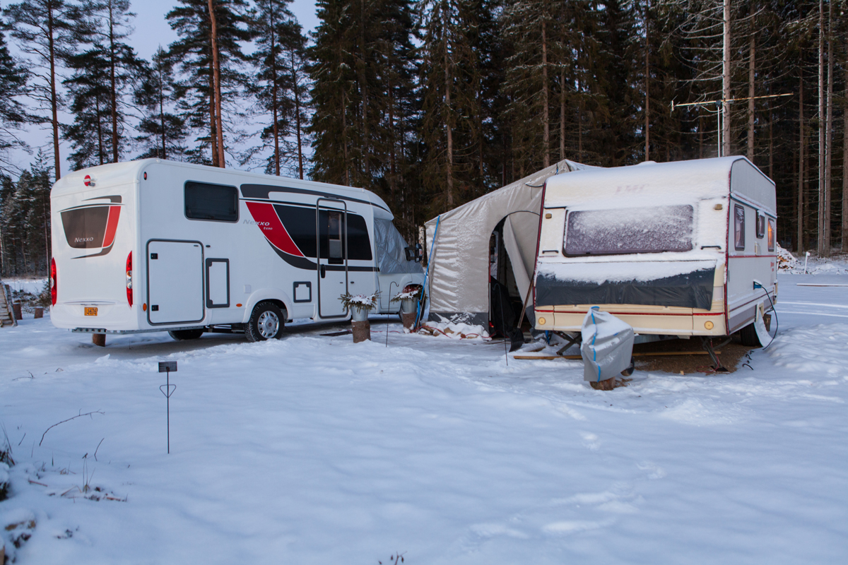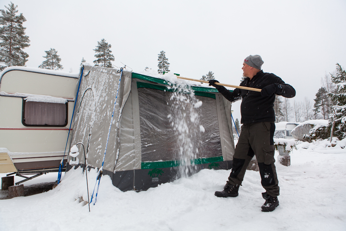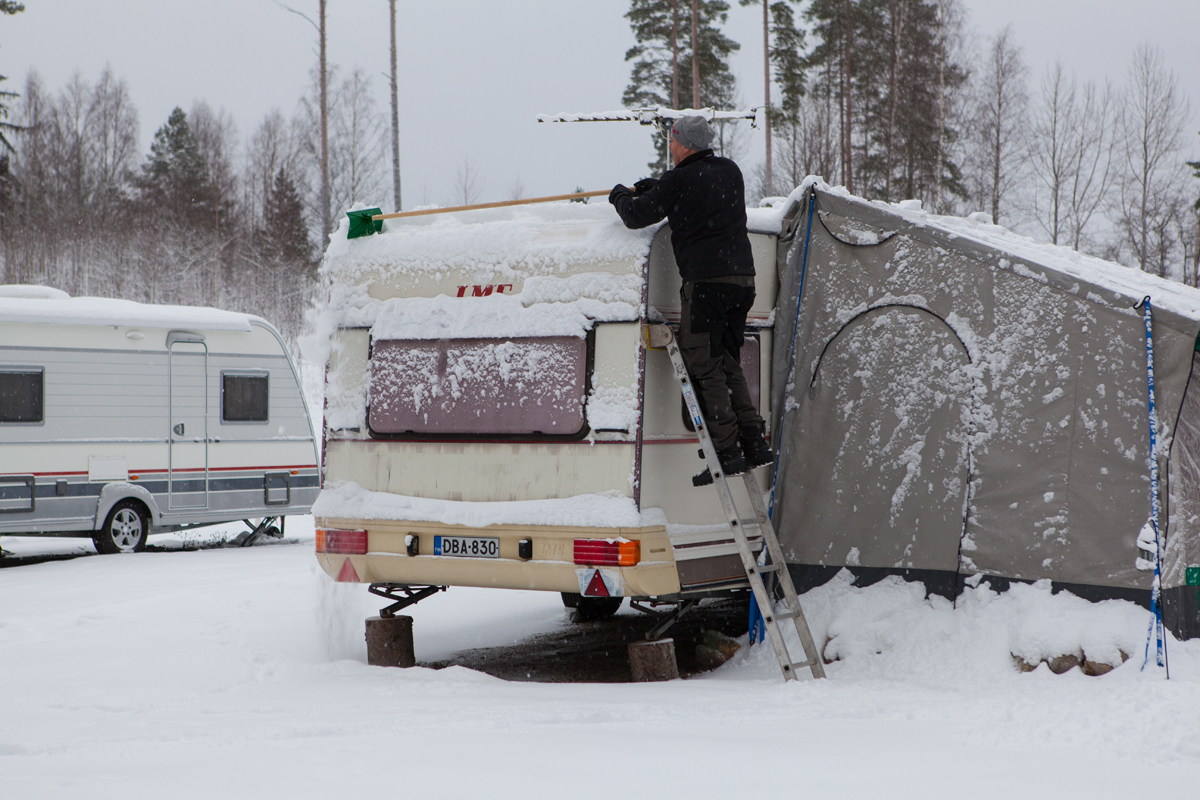Taas on satanut lunta. Ajamme Myllikseen kolistelemaan lumia teltan katolta mutta joku kehveli on ehtinyt ensin! Vaunun katto on sentään jätetty meille. Täällä on sovittu että toisten telttoja putsaillaan mutta vaunun katolla kun on monenlaisia luukkuja ja venttiilejä ja eri paikoissa, niin ne hoitaa jokainen itse. Hieno käytäntö!