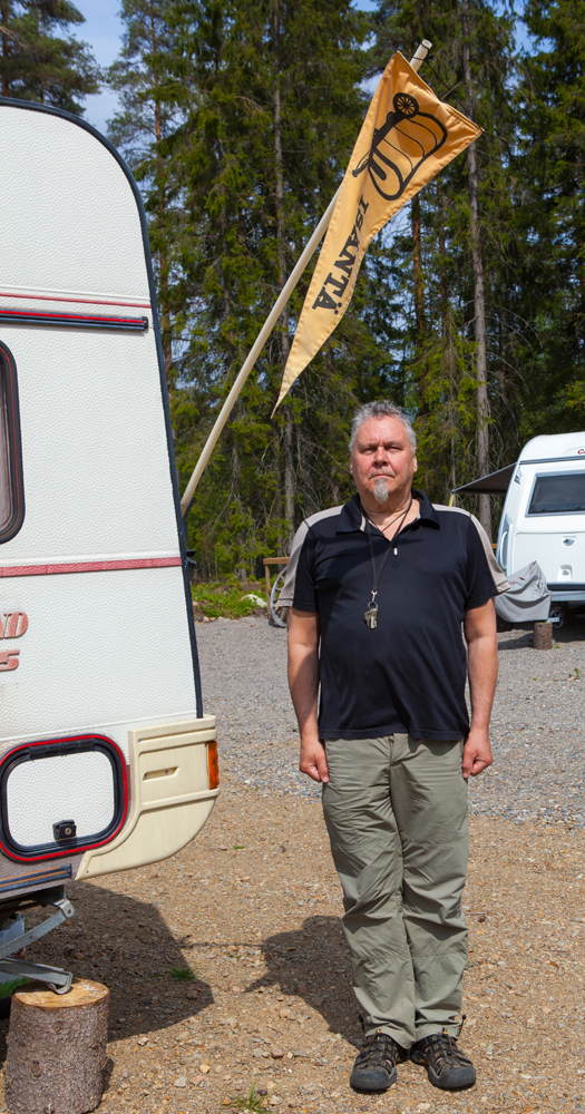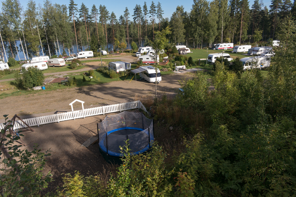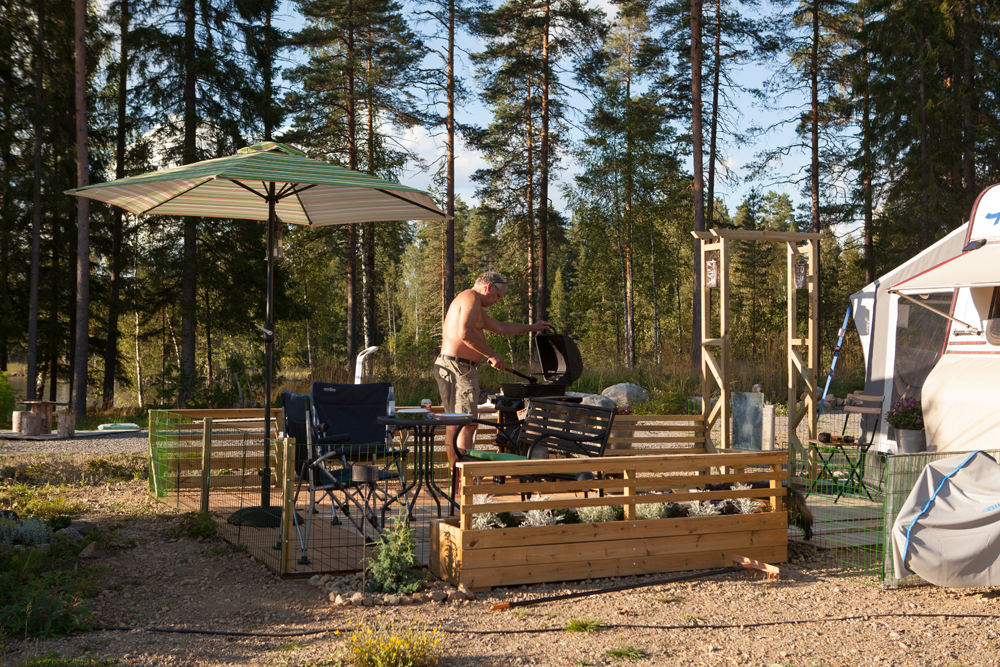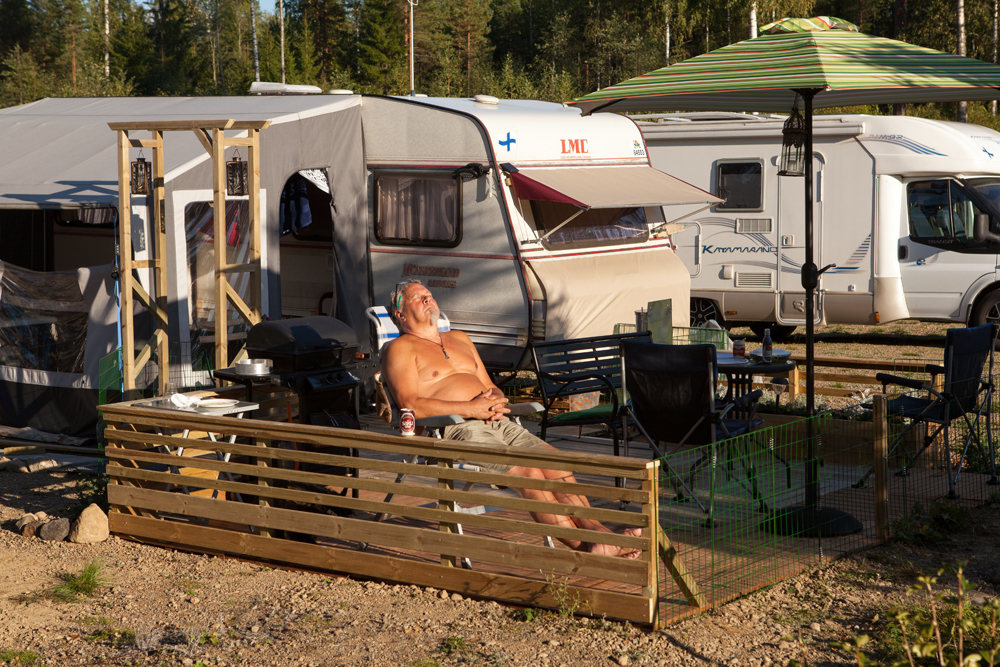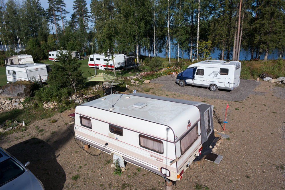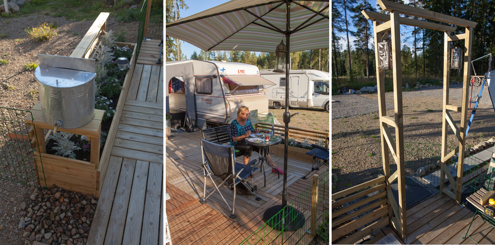 Saunasta käydään uimassa nakuna. Tuuli vei pressukatoksen ja saunarantaan kaivattaan uutta näkösuojaa, vaikka alaston karavaanari onkin tunnetusti komea näky!