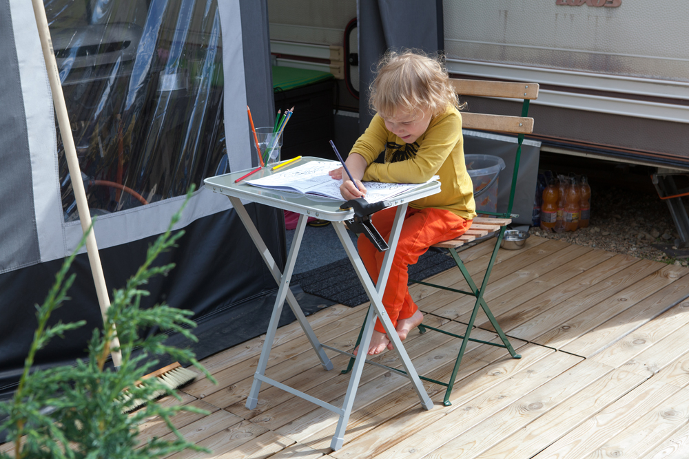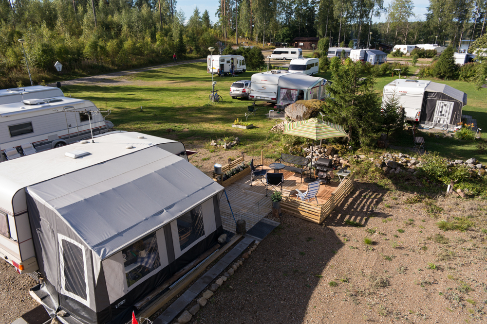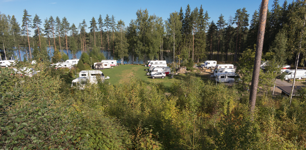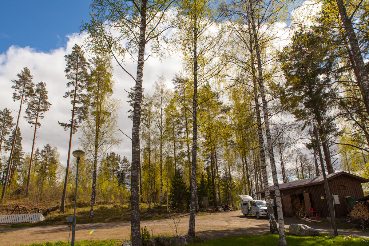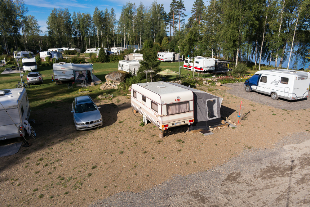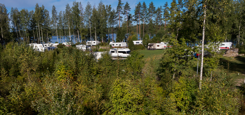 Saunasta käydään uimassa nakuna. Tuuli vei pressukatoksen ja saunarantaan kaivattaan uutta näkösuojaa, vaikka alaston karavaanari onkin tunnetusti komea näky!