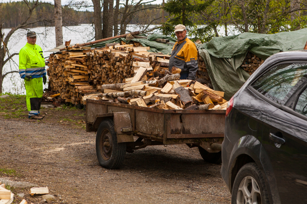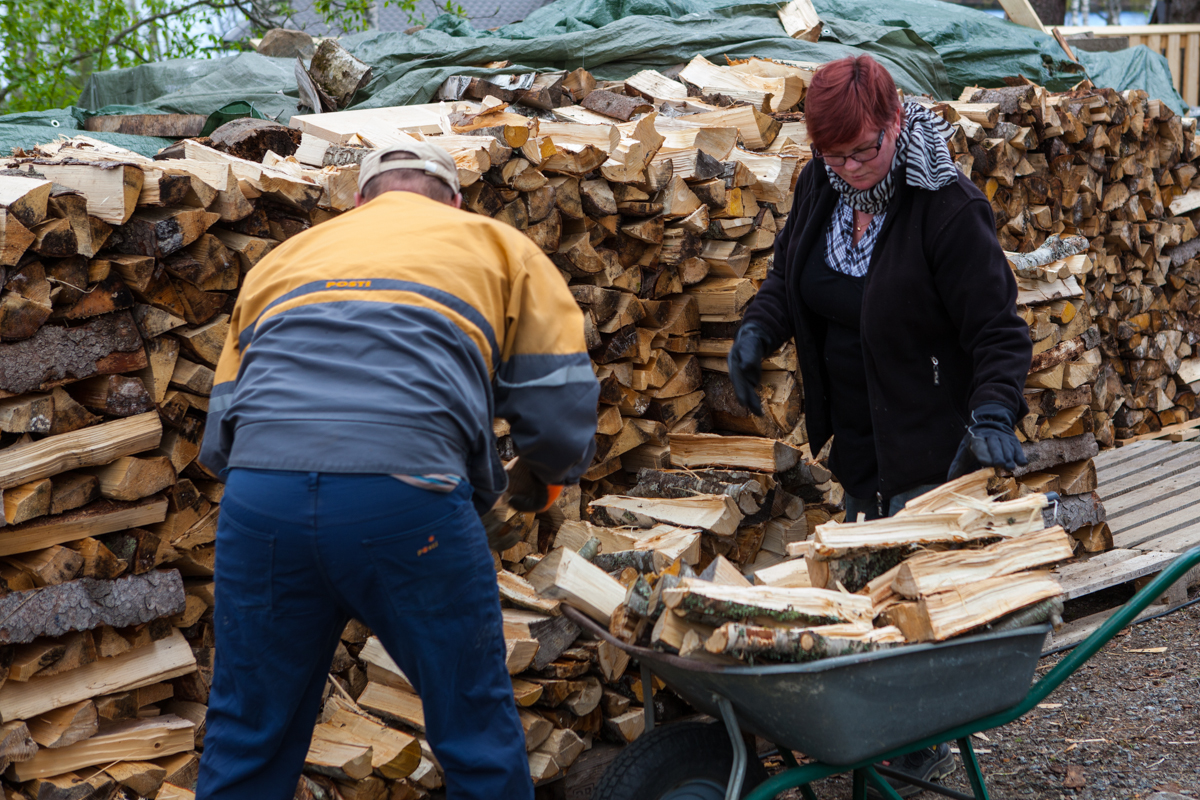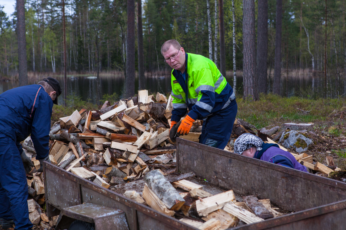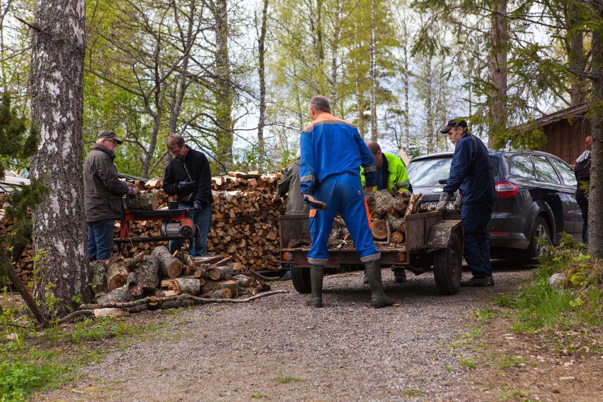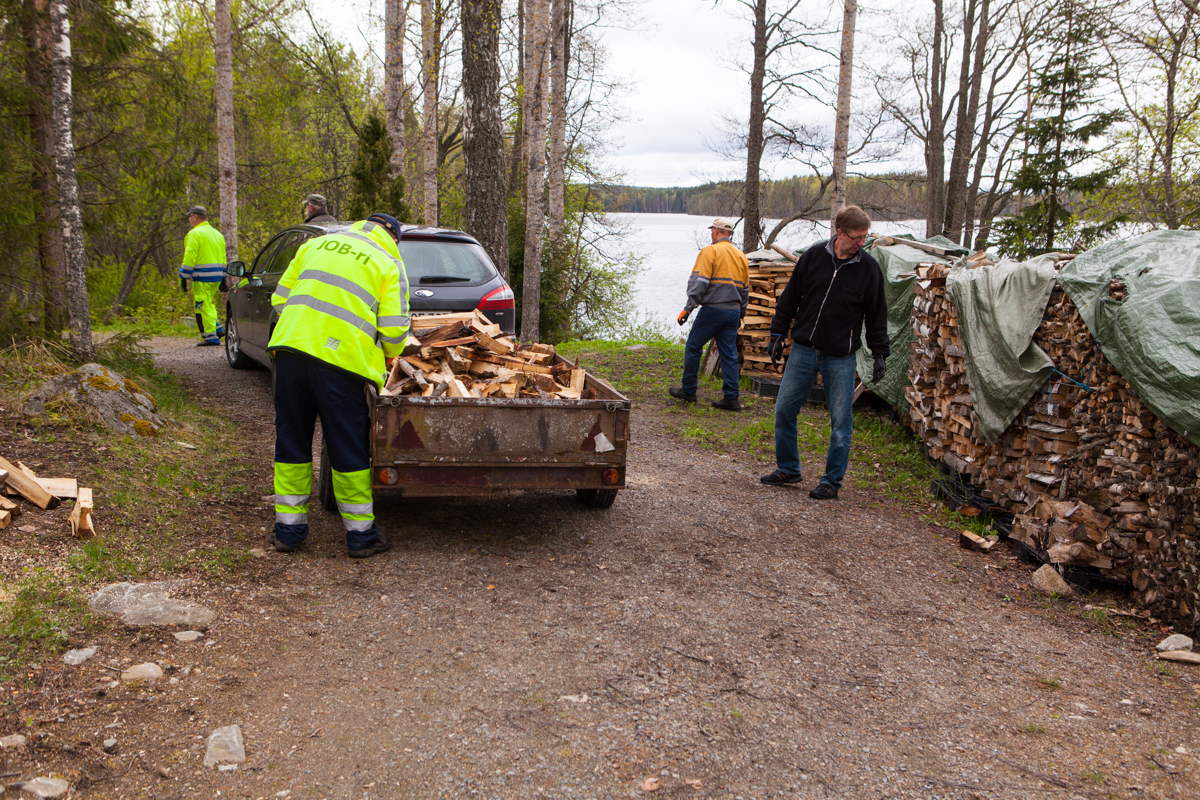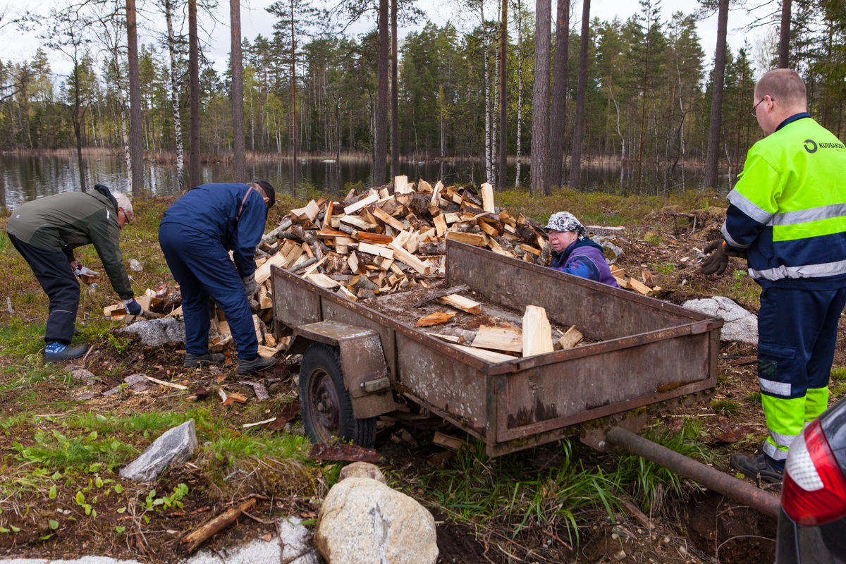 Uuden alueen rannasta kaadettiin viime vuonna kuusia ja muuta puuta. Nyt pilkotut puut siirretään liiterin lähelle pinoon ja kuivumaan.