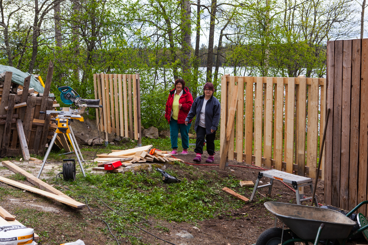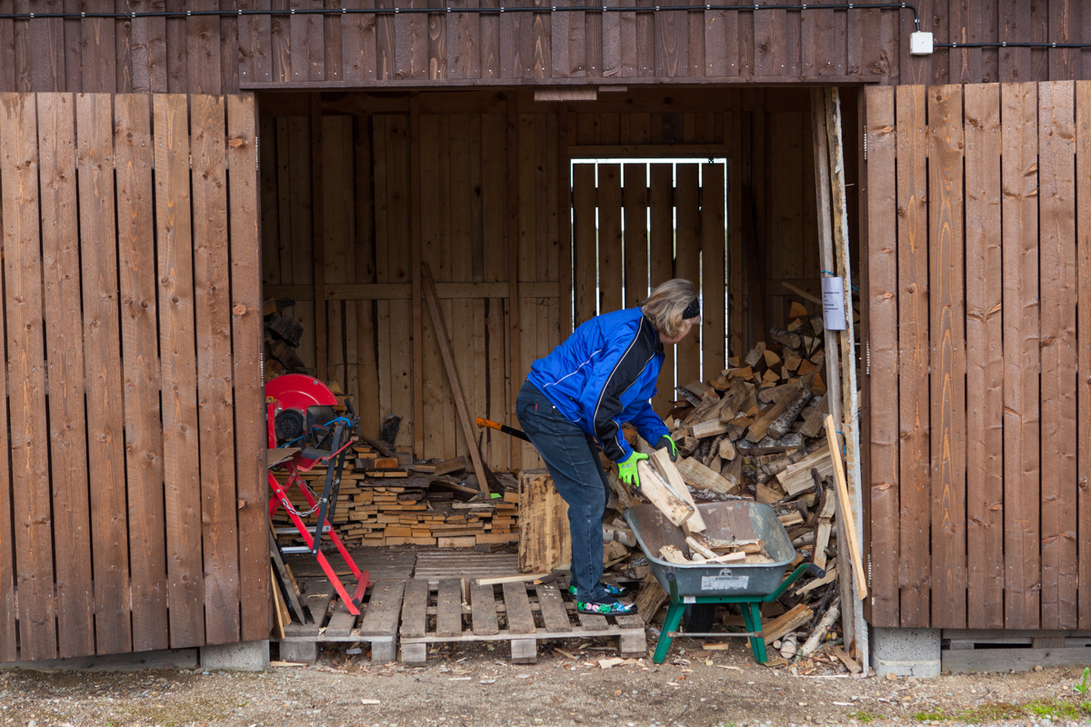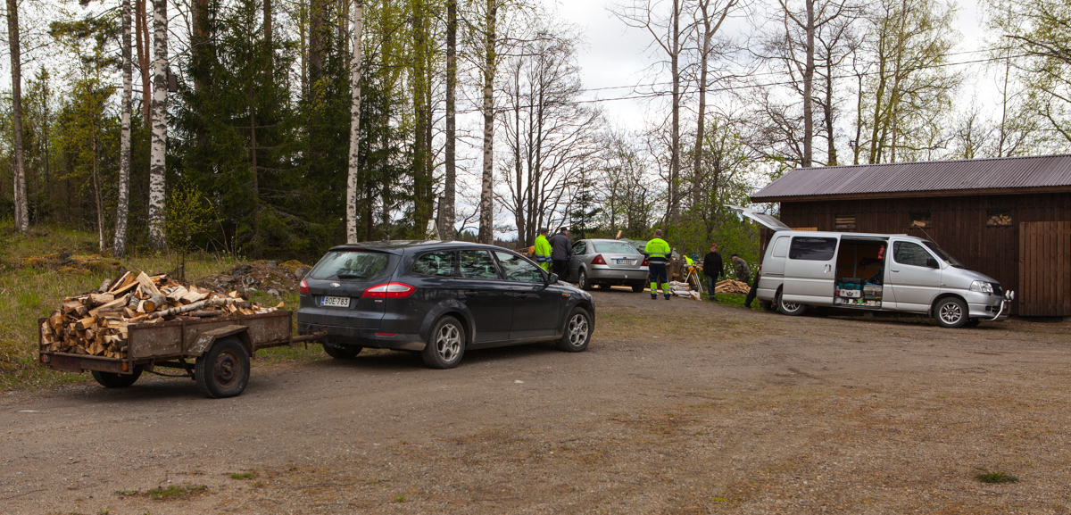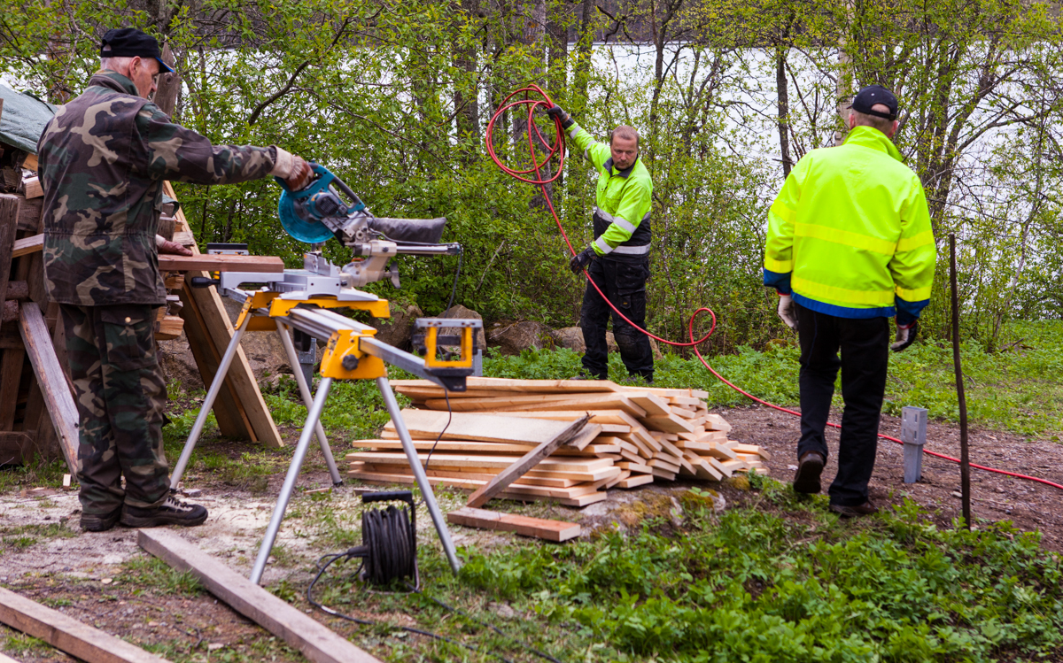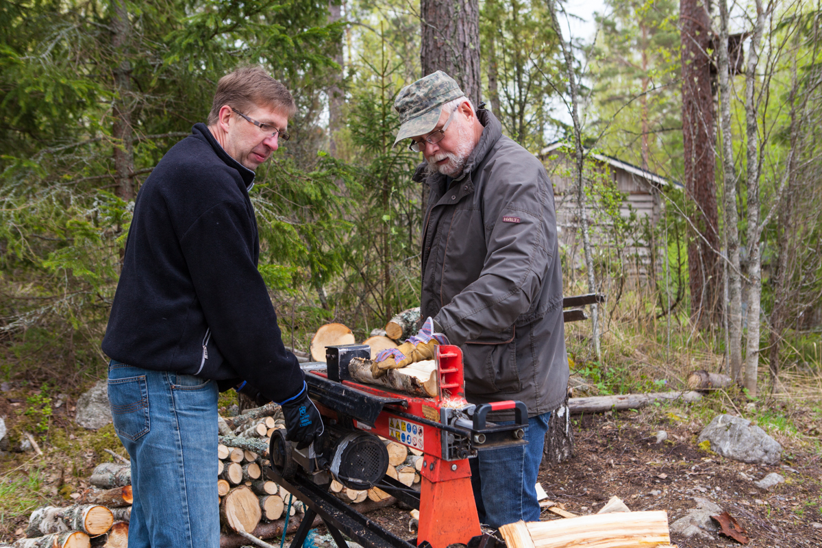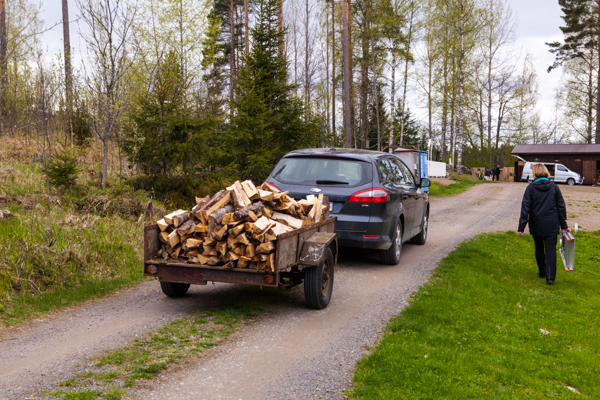 Uuden alueen rannasta kaadettiin viime vuonna kuusia ja muuta puuta. Nyt pilkotut puut siirretään liiterin lähelle pinoon ja kuivumaan.