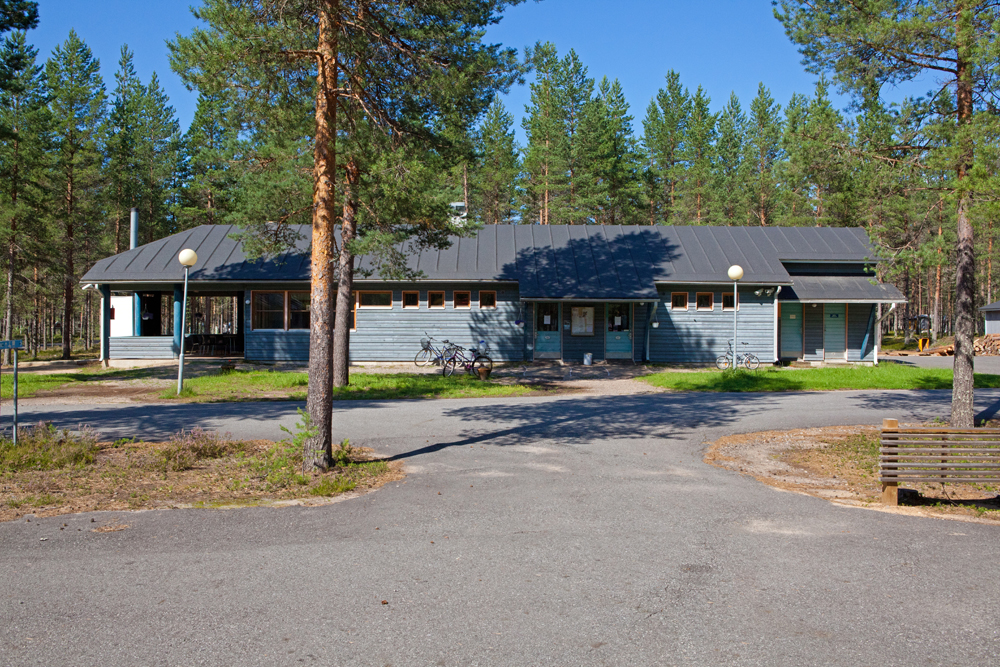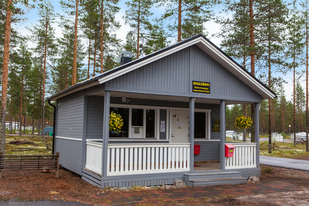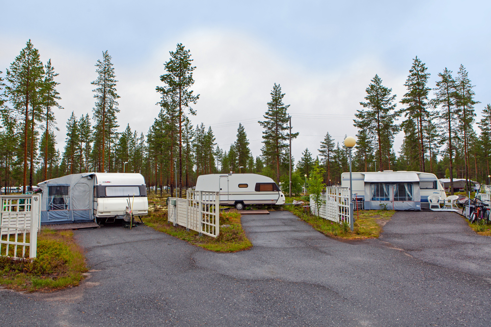 Caravan-alue löytyy noin sata metriä ennen rantaa. Toimisto on keskeltä aluetta, huoltorakennuksen vieressä omassa hirsirakennuksessaan.
