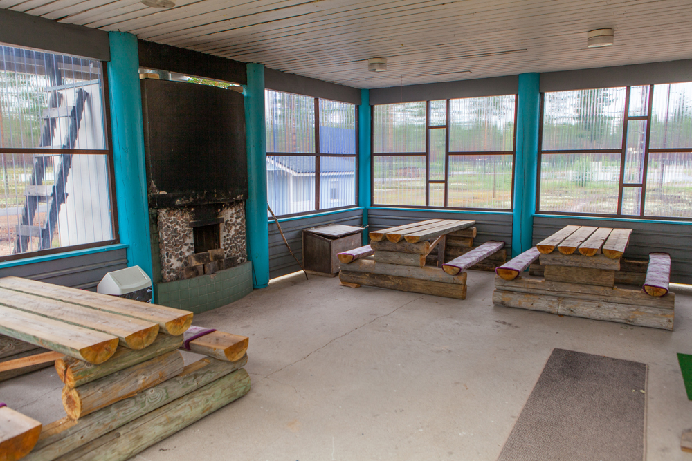 Suurehko huoltorakennus on kaikkien ulottuvilla keskeltä aluetta. Samana katon alta löytyvät vessat ja suihkut sekä keittiö. Toisessa päässä taloa on laajahko kokoontumistila ja takka grillaukseen. Huoltorakennuksessa on yleinen sauna.