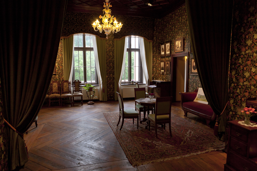 Saleissa on kalusteet, upeita seinäpanelointeja ja koristeellisia tapetteja.
