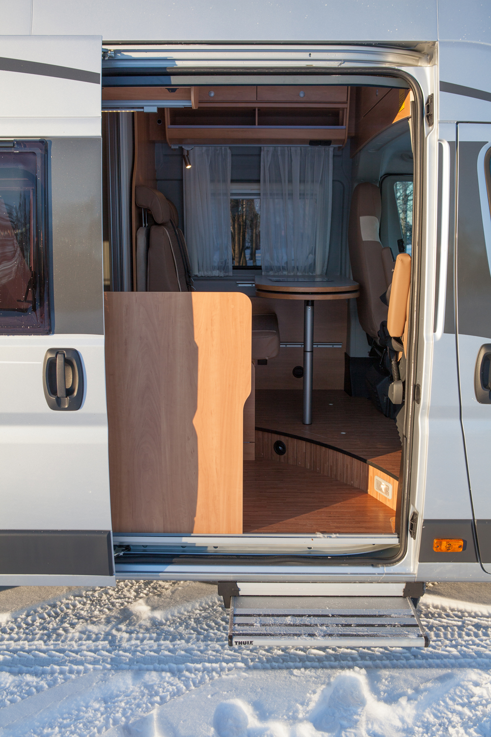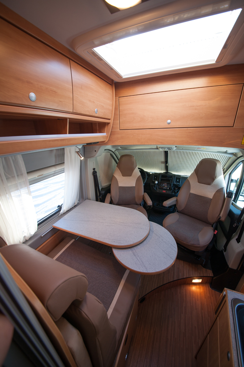 Kattoikkuna tuo hyvin valoa olotilaan. Auton katto keulassa on melko pysty mutta sen ansiosta eteen ylös mahtuu suuri kaappi.