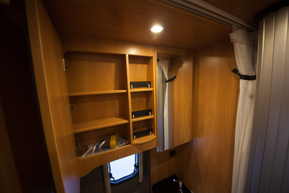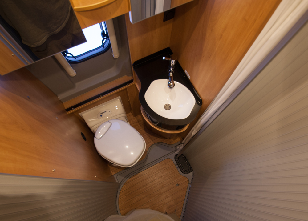 Vessa- ja suihkutila on kekseliäs tilankäytön suhteen. Kemiallisen vessan istuin ja pesuallas ovat pienessä komerossa alumiinisen rullaliukuoven takana. Näin ne eivät vie tilaa kuin puoli neliömetriä, silloin kun eivät ole käytössä. Suihkuallas on keskellä auton käytävää puukannen alla.