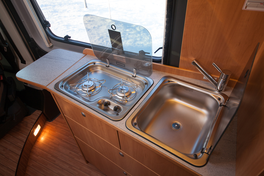 Tiskipöydässä oikealla on teräksinen pesuallas ja vasemmalla Dometicin kaksiliekkinen kaasuliesi. Työtasoa saadaan lisää tiskin päästä ylöskäännettävällä aputasolla. Pituutta tiskillä on tällöin 150 senttiä ja leveyttä 40 – 50 cm. Dometicin 80-litrainen jääkaappi on keittiön peräpuolella. Kaapissa on viiden litran pakastelokero.