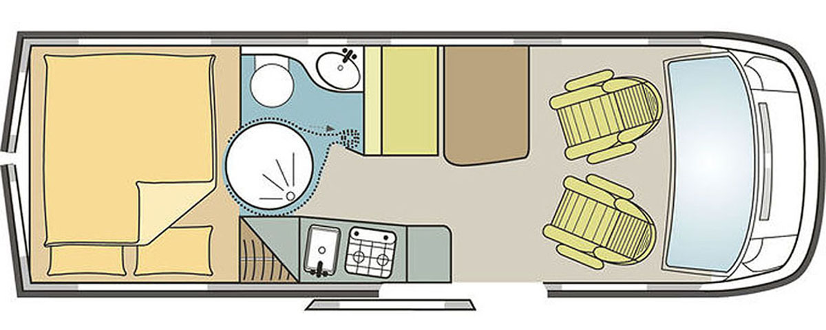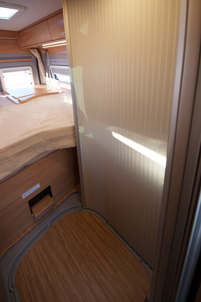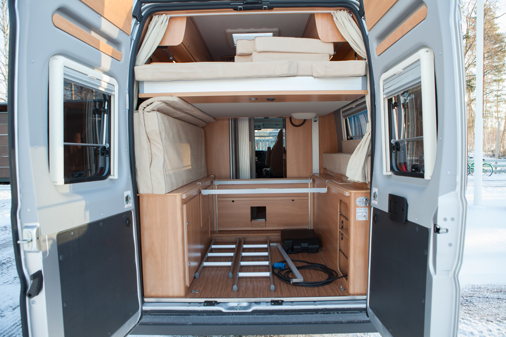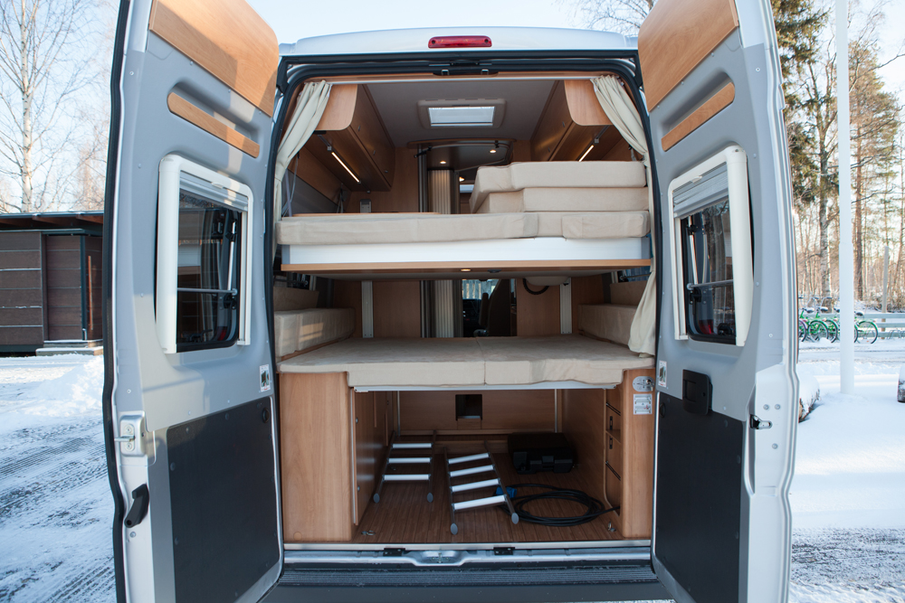 Makuuhuoneessa on vakiovarusteena koko auton levyinen parivuode pitkittäin.