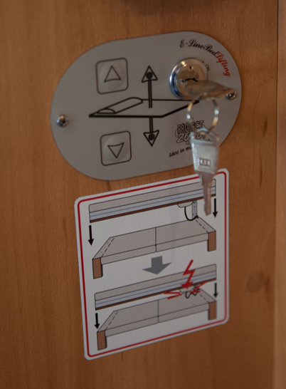 Vuoteen alla on tavaratila, jossa oikealla sivulla vesisäiliö ja vasemmalla kaksi kaappia ja kaasupullokaappi. Kun sänky on nostettu maksimikorkeudelle on tallilla korkeutta puolitoistametriä.