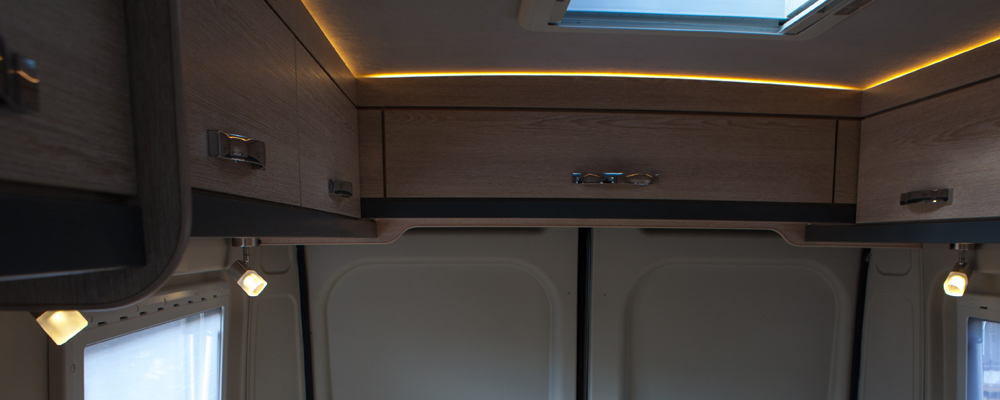 Valaisimet ovat sähköpihejä led-valoja. Makuutilassa on neljä kohdevaloa sekä yläkaappien reunaa kiertävä led-nauha. Keittiössä on yläkaapin alapuolella led-putki, pituudeltaan 56 senttiä.