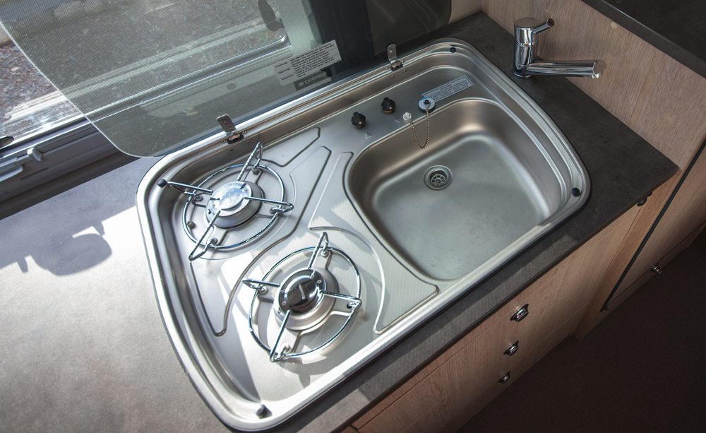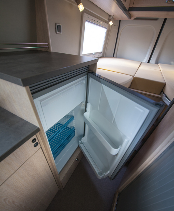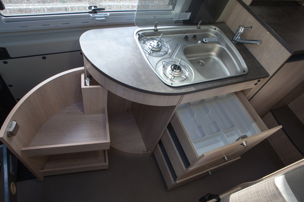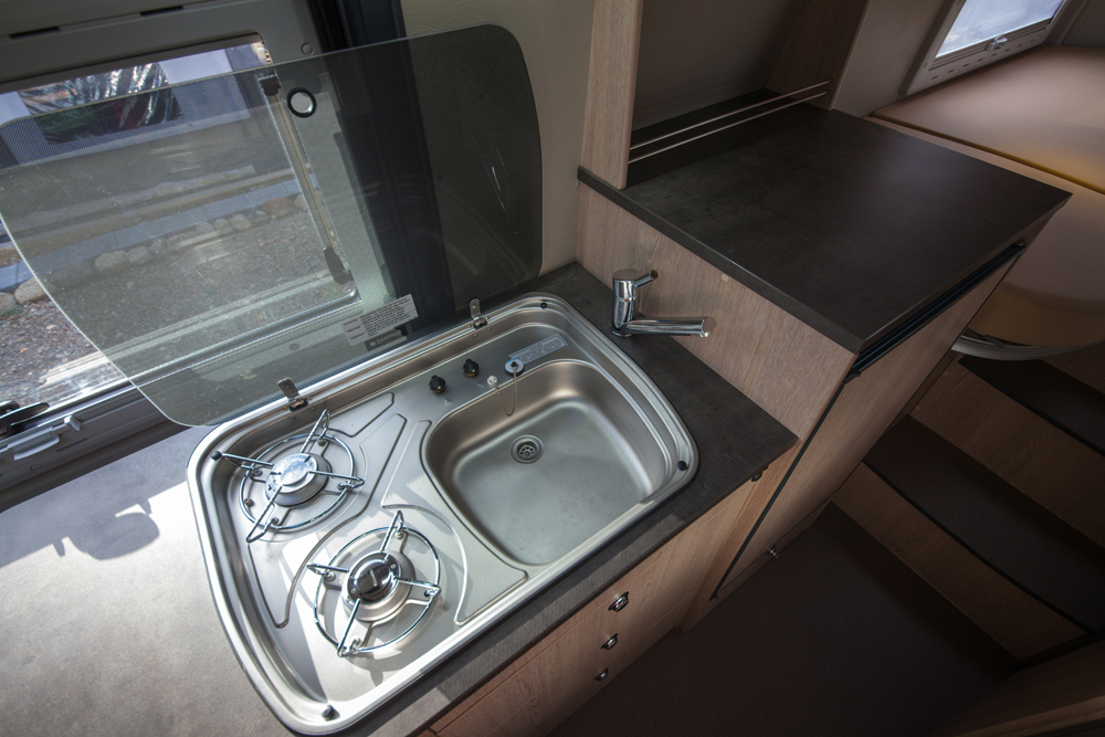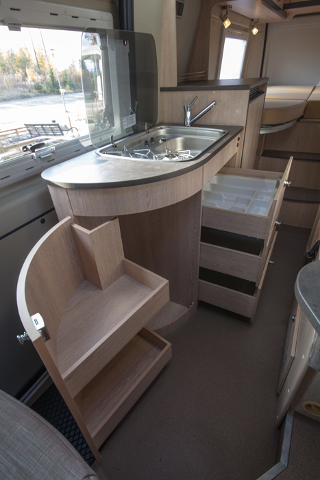 Keittiön tiskipöytä on pienehkö, kuten retkeilyautoissa yleensä. Ovenpuoleisesta päästä pyöristetyn tiskipöydän koko on 97 x 50 senttiä. Lisätilaa tuon jääkaapin päällä oleva taso, kooltaan 53 x 55 cm. Lattiatilaa on keittiössä riittävästi mutta taakse kulkevaa joutuu kokki hieman väistämään.