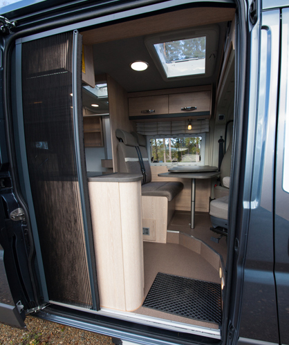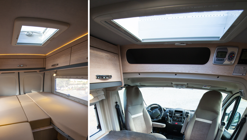 Olohuoneen katossa ja makuutilassa on läpinäkyvät avattavat kattoluukut. Olotilan luukkuna on 40 x 60-senttinen Dometic Seizzin kattoikkuna.