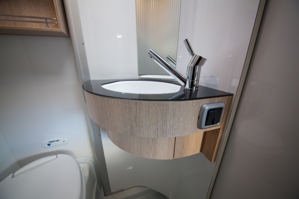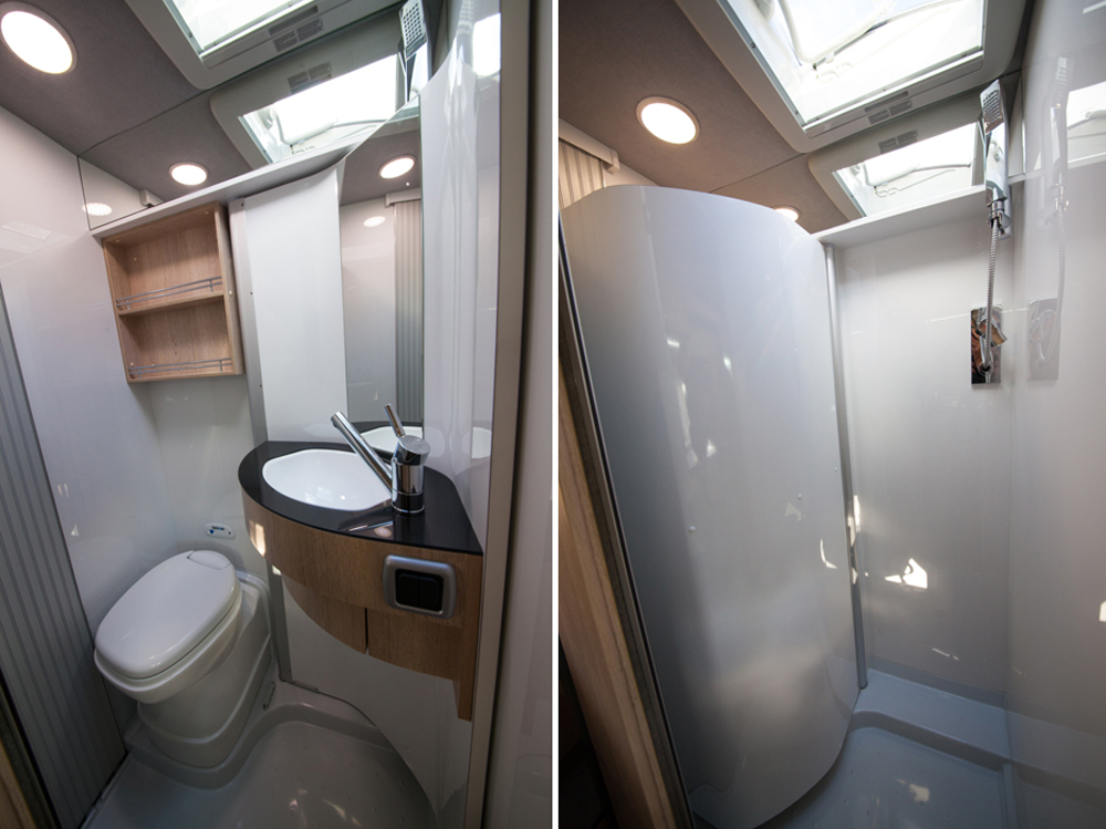 Pieni vessa- ja suihkutila säästää tilaa asumiseen. Kun tarvitaan suihkua, pyöräytetään kemssaistuin suoraan ja käännetään pesuallasseinä wc-istuimen päälle. Seinän takaa paljastuu suihkutila, jossa on oma suihkuhana. Vessan ovena on alumiininen rulo-ovi. Ovi liukuu herkästi, jopa kiusallisen herkästi. Ajon aikana se liukuu kiihdytyksessä taakse, aukiasentoon ja tömähtää jarrutuksessa kiinni. Ensimmäinen kerta hieman säikäytti.