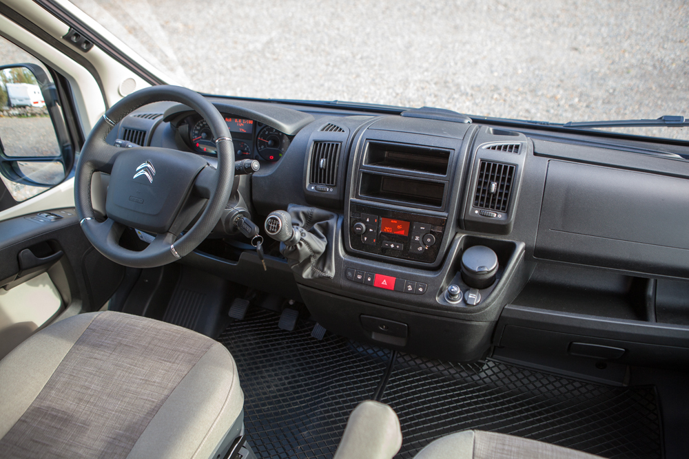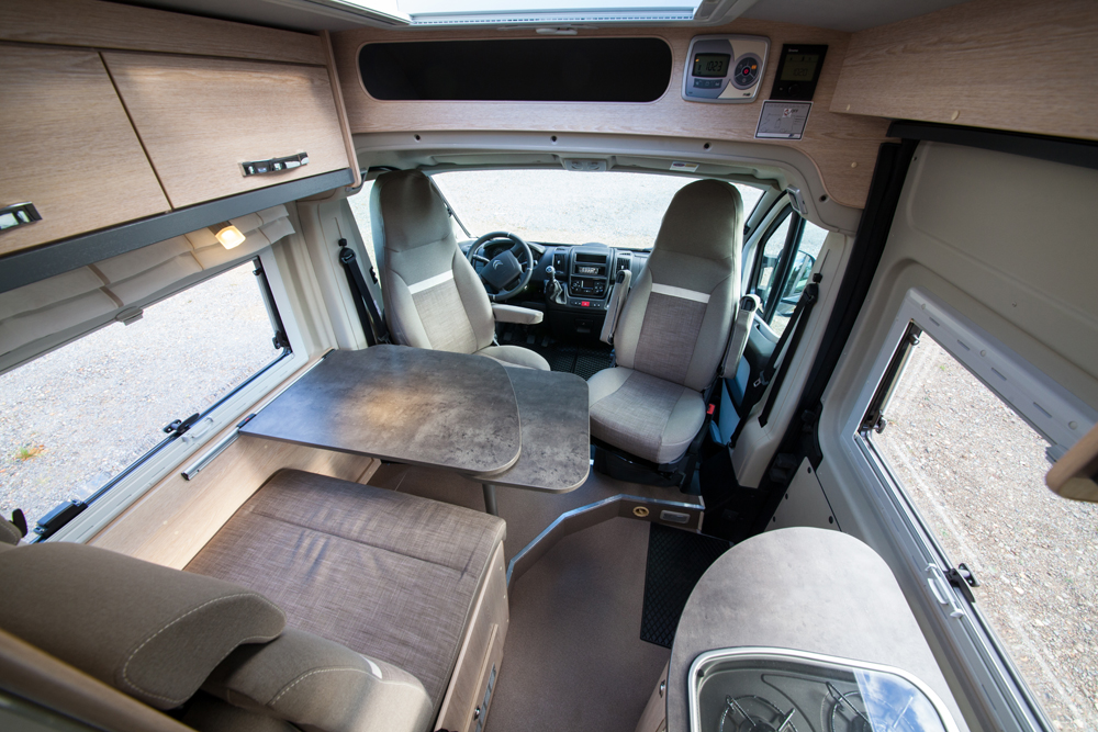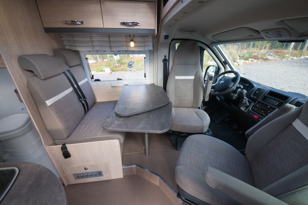Istuinryhmän on pienehkö ja sohva hieman ahdas kahdelle hengelle. Neljäkin mahtuu kyllä iltaa istumaa. Ohjaamon istuimet pyörähtävät kevyesti ympäri. Kuljettajan istuinta käännettäessä pöytä pitää olla taka-asennossa. Pöydän pinta on tummanharmaata iskunkestävää muovia. Pöytälevyn pää on pyöristetty helpottamaan kulkua ohjaamoon. Pöydän alta kääntyy esiin lisälevy.