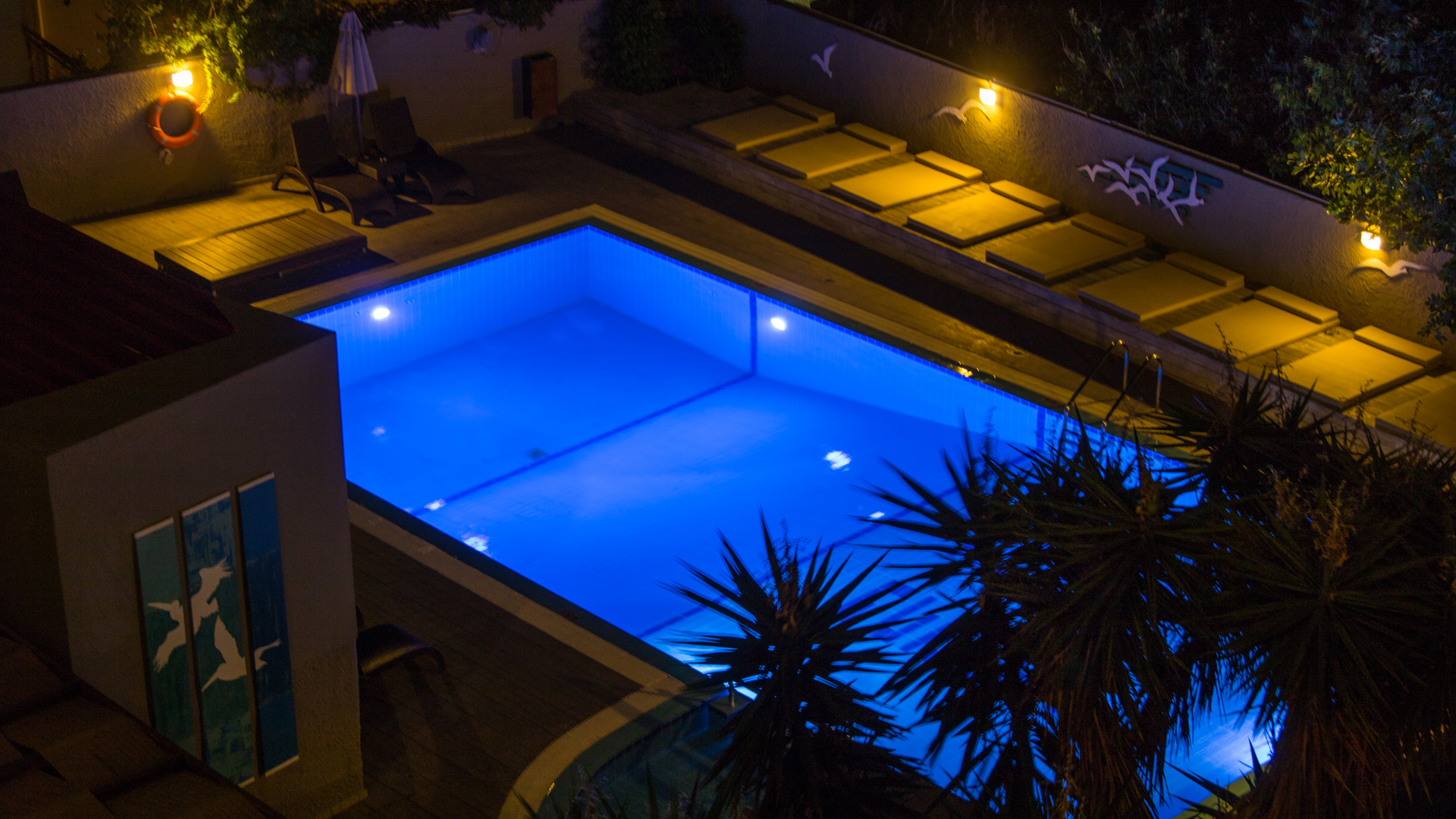 Asumme hotellin neljännessä kerroksessa. Huoneen edustalla on parveke, jonne paistaa auringonnoususta alkuiltapäivään. Parvekkeelta on näkymä vanhan kaupungin suuntaan ja sisäpihan uima-altaalle. Tietysti merinäkymä ja auringonlasku olisi kiva mutta tässä on etuna se että huone ehtii jo vähän jäähtyä yöksi, kun aurinko kääntyy talon toiselle puolelle. Ilmastointilaitekin huoneessa on, (pienestä lisämaksusta kapula) mutta vanhat koneet tahtovat olla hieman meluisia.
