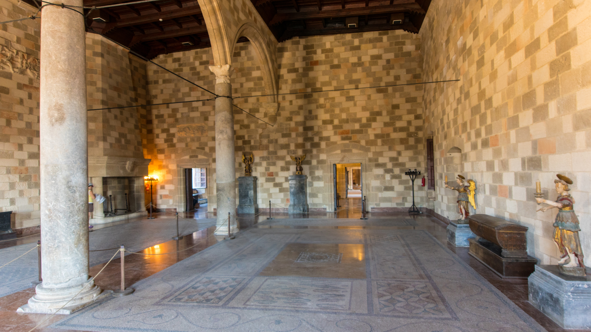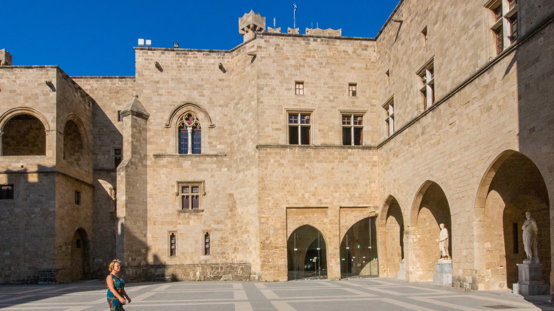 Lopuksi tutustumme komeaan Suurmestarien Palatsin koristeellisiin saleihin. Päivä on kuuma mutta paksujen kiviseinien sisällä on mukavan viileää. Rakennuksessa toimii myös bysanttilainen museo. Samalla paikalla oli 600-luvulla bysanttilainen palatsi. 1300-luvulla Pyhän Johanneksen ritarit rakensivat palatsin Suurmestarin asuinpaikaksi ja hallintokeskukseksi. Palatsi tuhoutui vuonna 1856 kun Pyhän Johanneksen kirkon kellariin piilotettu suuri määrä ruutia räjähti. Italialaiset jälleenrakensivat Suurmestarin palatsin alkuperäisten piirustusten mukaan vuonna 1940.