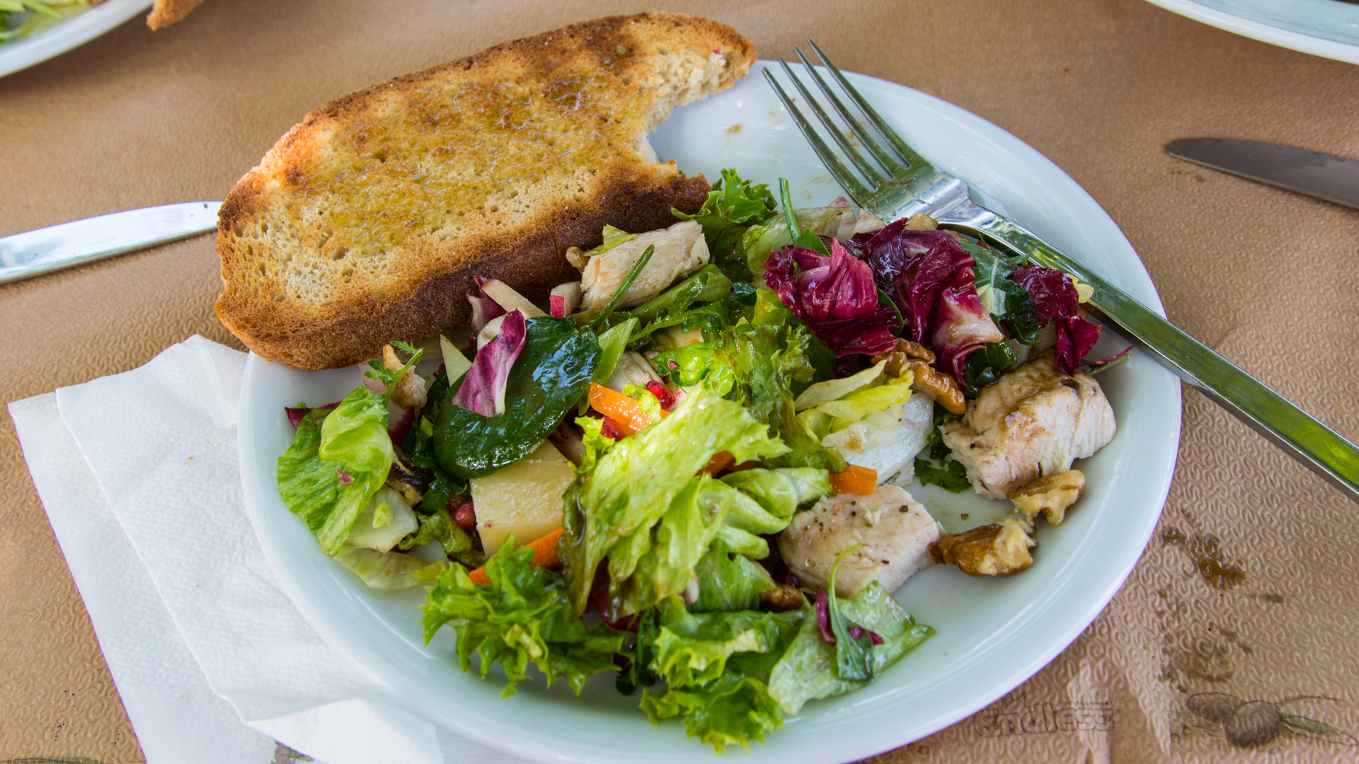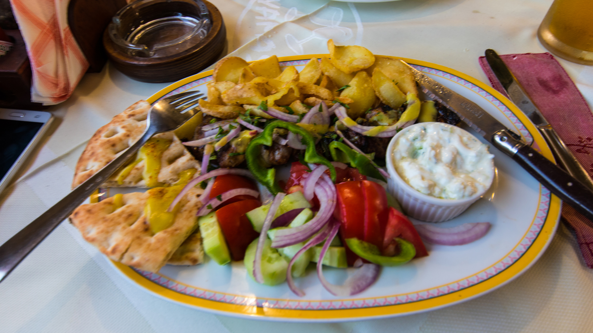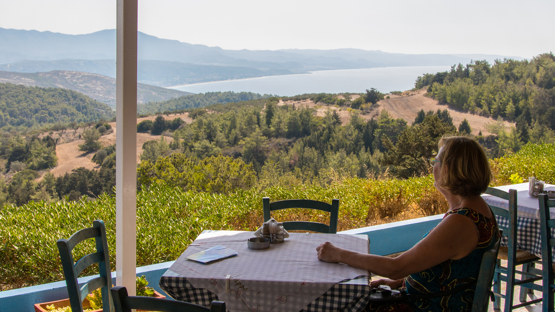 Monolithoksen kylässä aterioimme rouheat kreikkalaiset salaatit kananmunan, kinkun ja paahtoleivän kera. Ravintolan terassi on rakennettu jyrkkään rinteeseen.