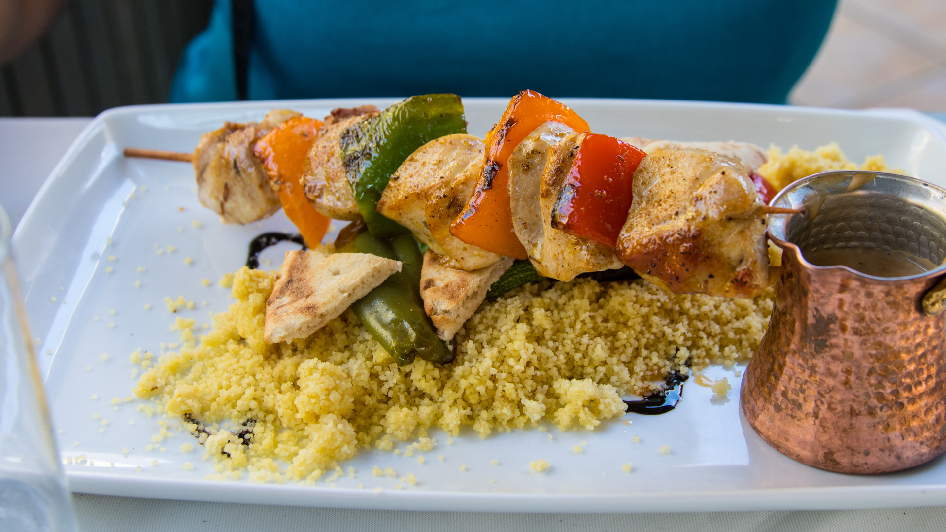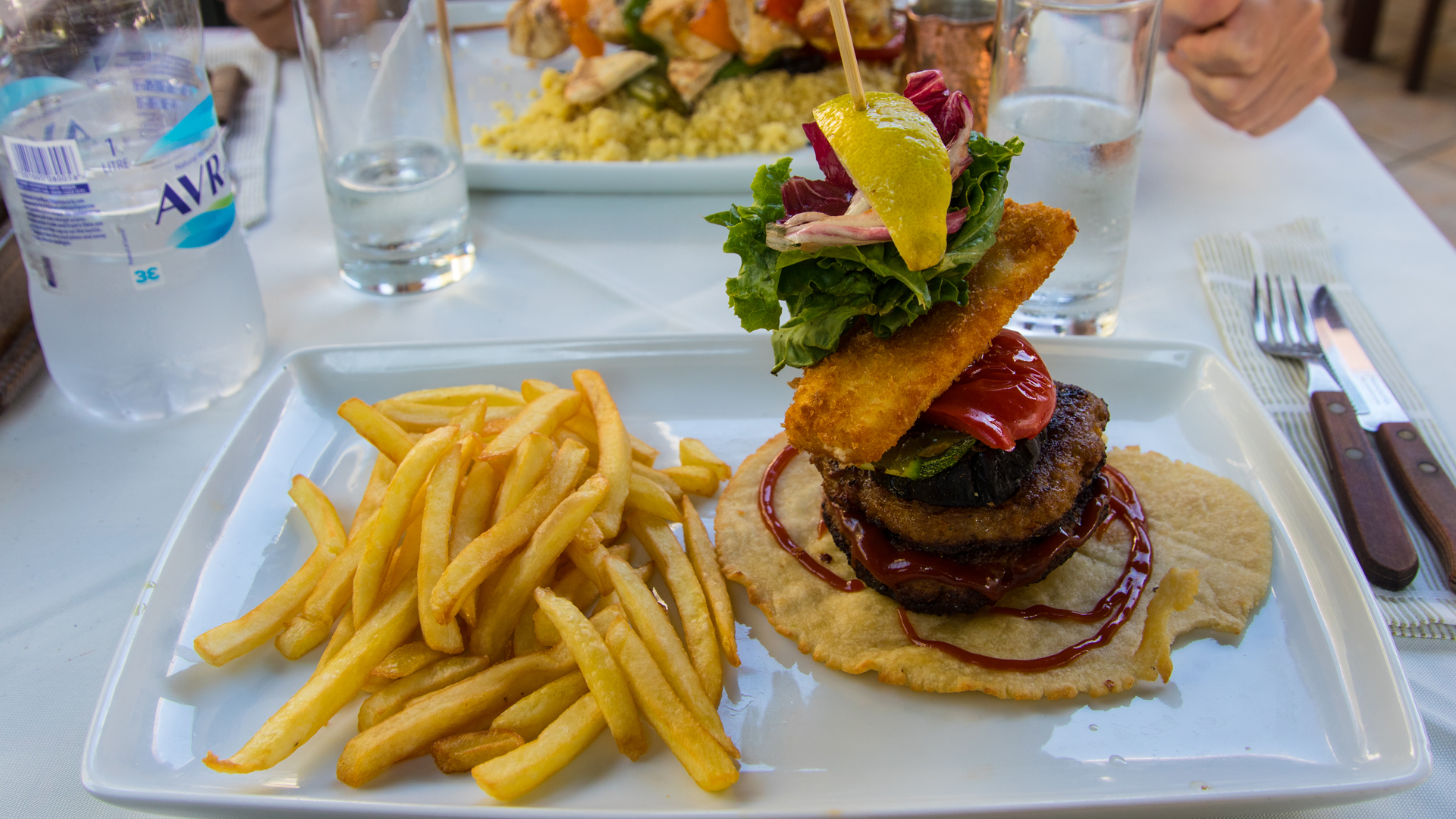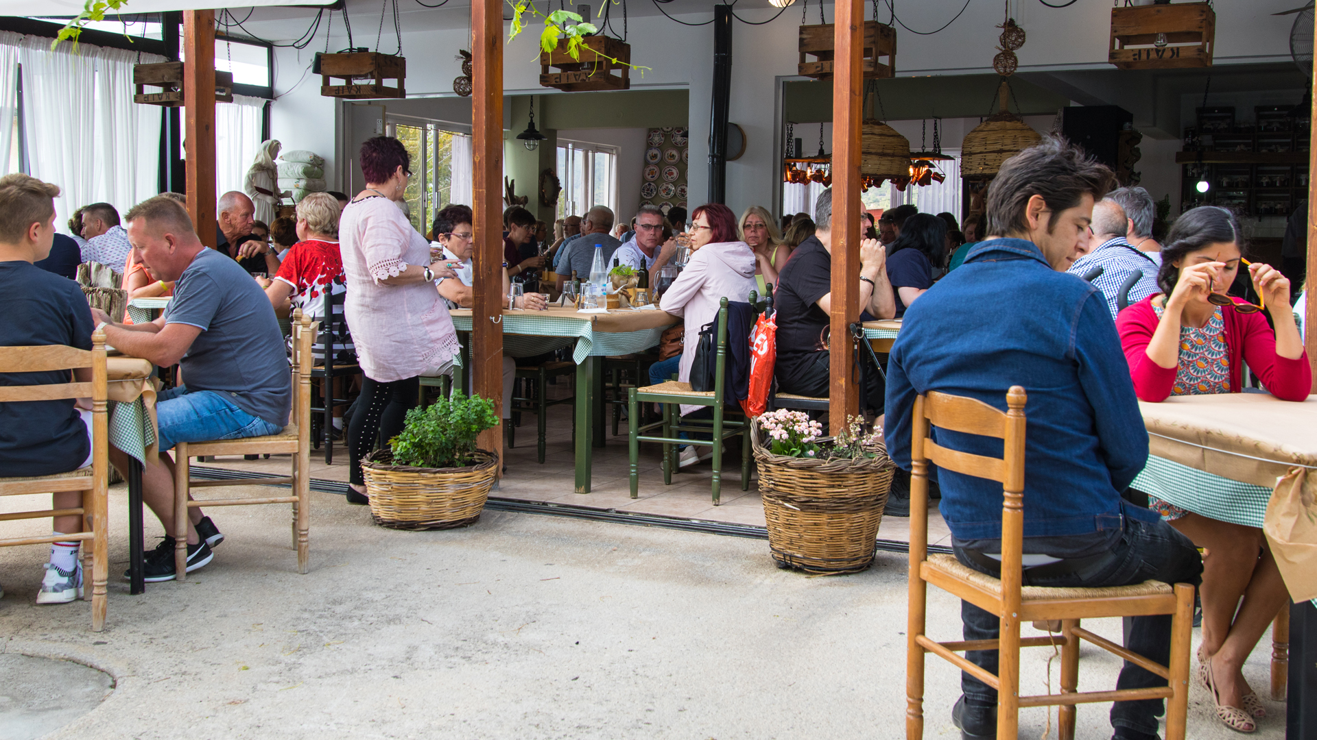 Monolithoksen kylässä aterioimme rouheat kreikkalaiset salaatit kananmunan, kinkun ja paahtoleivän kera. Ravintolan terassi on rakennettu jyrkkään rinteeseen.