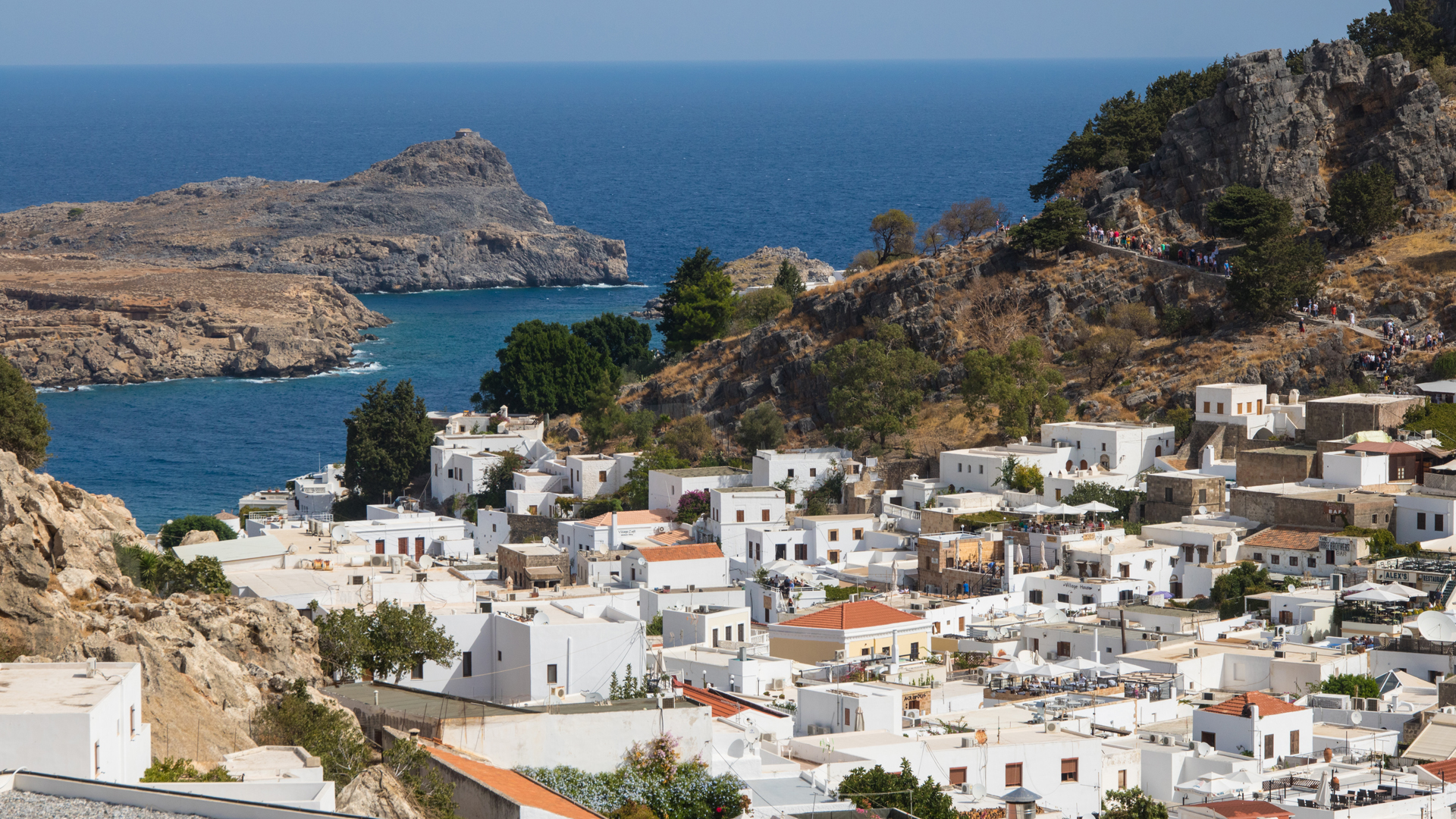 Lindoksen kylän tiheään rakennetut talot ovat kalliorinteellä vieri vieressä. Ainoa kaduille mahtuva ajoneuvo on aasi. Talojen kattotasanteille on rakennettu ravintolan terasseja. Yhdellä sellaisella nautimme kahvista, maisemien lisäksi.
