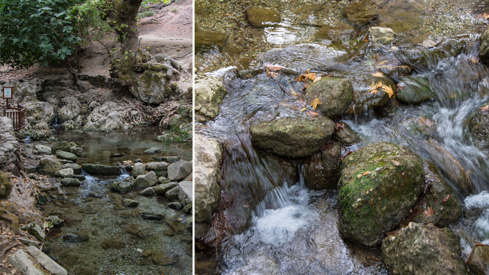 Kahvilla poikkeamme Epta Pigesissä, eli Seitsemällä Lähteellä. Kukkuloiden välissä on lähdevesistä muodostunut pieni keidasmainen lampi. Vieressä on Agios Nikolaoksen kirkko.