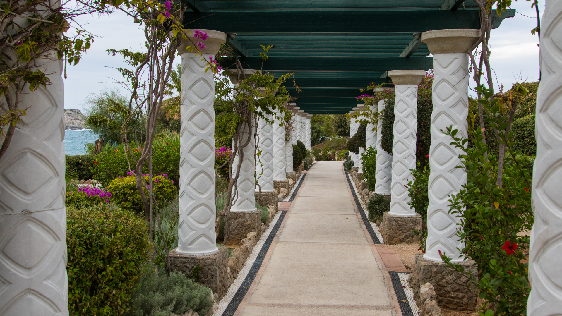 Meren puolelta pääsee portin läpi satamaan, jossa huviveneet ja kalastuspaatit kelluvat muurien suojassa. Taustalla kohoaa korkea valkoinen seinä, ikkunoita vieri vieressä. Sataman taakse on kiinnittynyt risteilyalus Jewel of the Seas.
