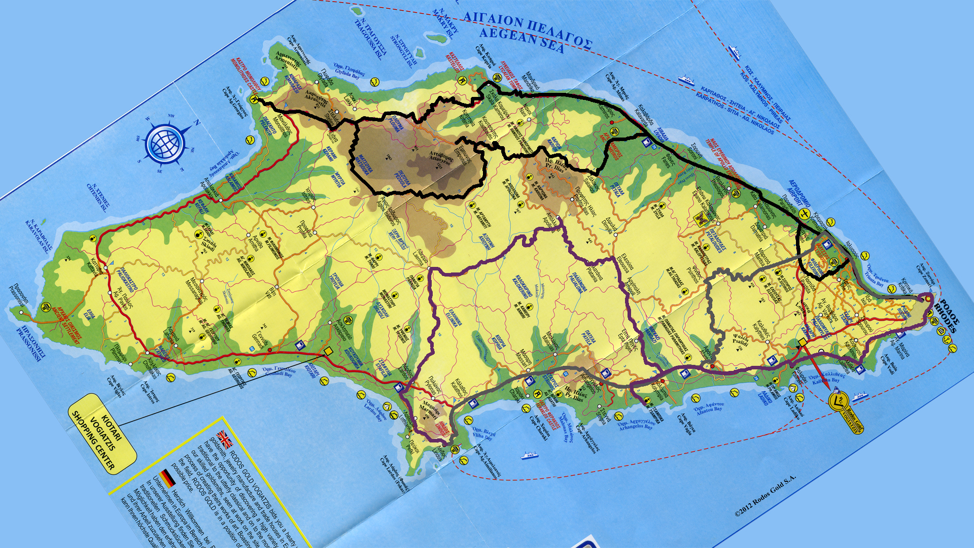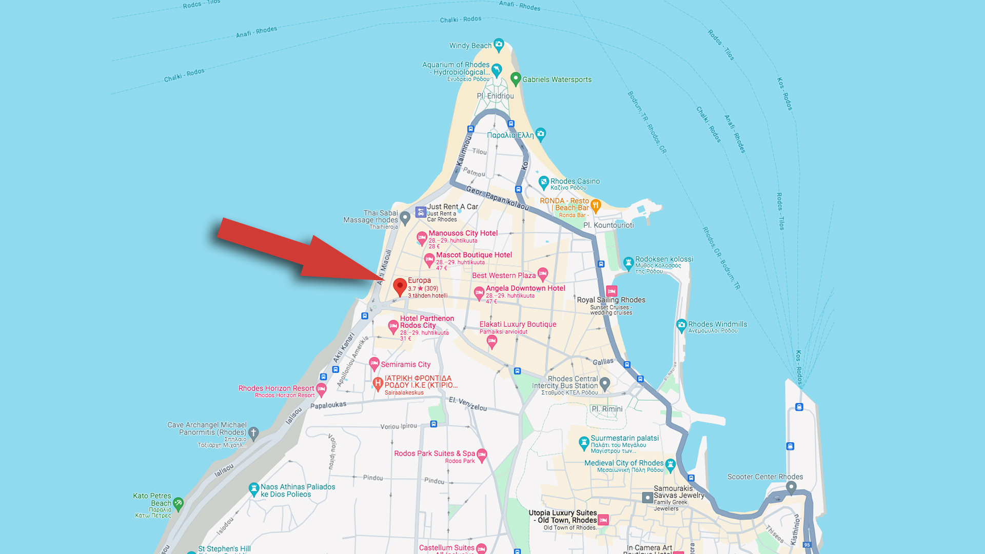 Hotelli Europa sijaitsee Saaren pohjoispäässä Rodoksen kaupungissa. Rakennus on jo hieman kulunut mutta siisti – ja mikä parasta sijainti on meille erinomainen. Olemme vanhan kaupungin rajalla. Heti hotellin ovelta pääsee vanhan kaupungin kapeille kävelykujille, missä on paljon kauppoja ja ravintoloita. Lännessä on 50 metrin päässä uimaranta. Idässä niemen toisella laidalla on laaja historiallinen linnoitus ja satama. Etelään päin lähtiessä ollaan heti päätiellä. Helppo siis lähteä kiertämään saarta autolla, jonka vuokraamme puolen viikon paikkeilla.
