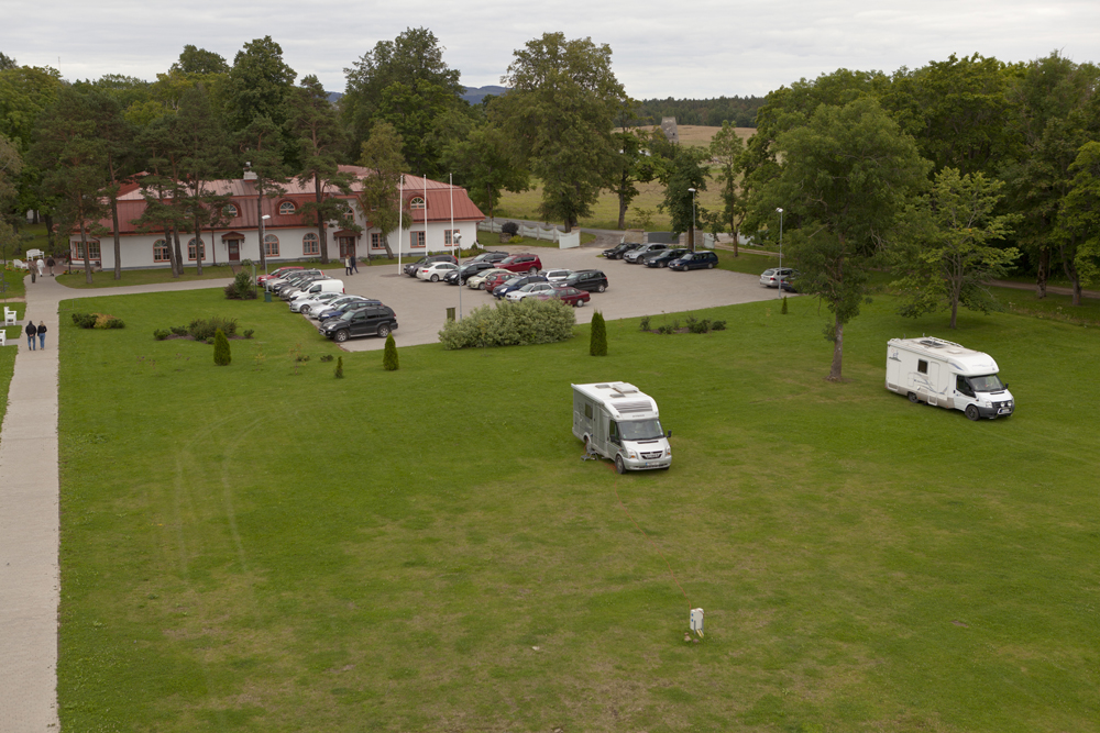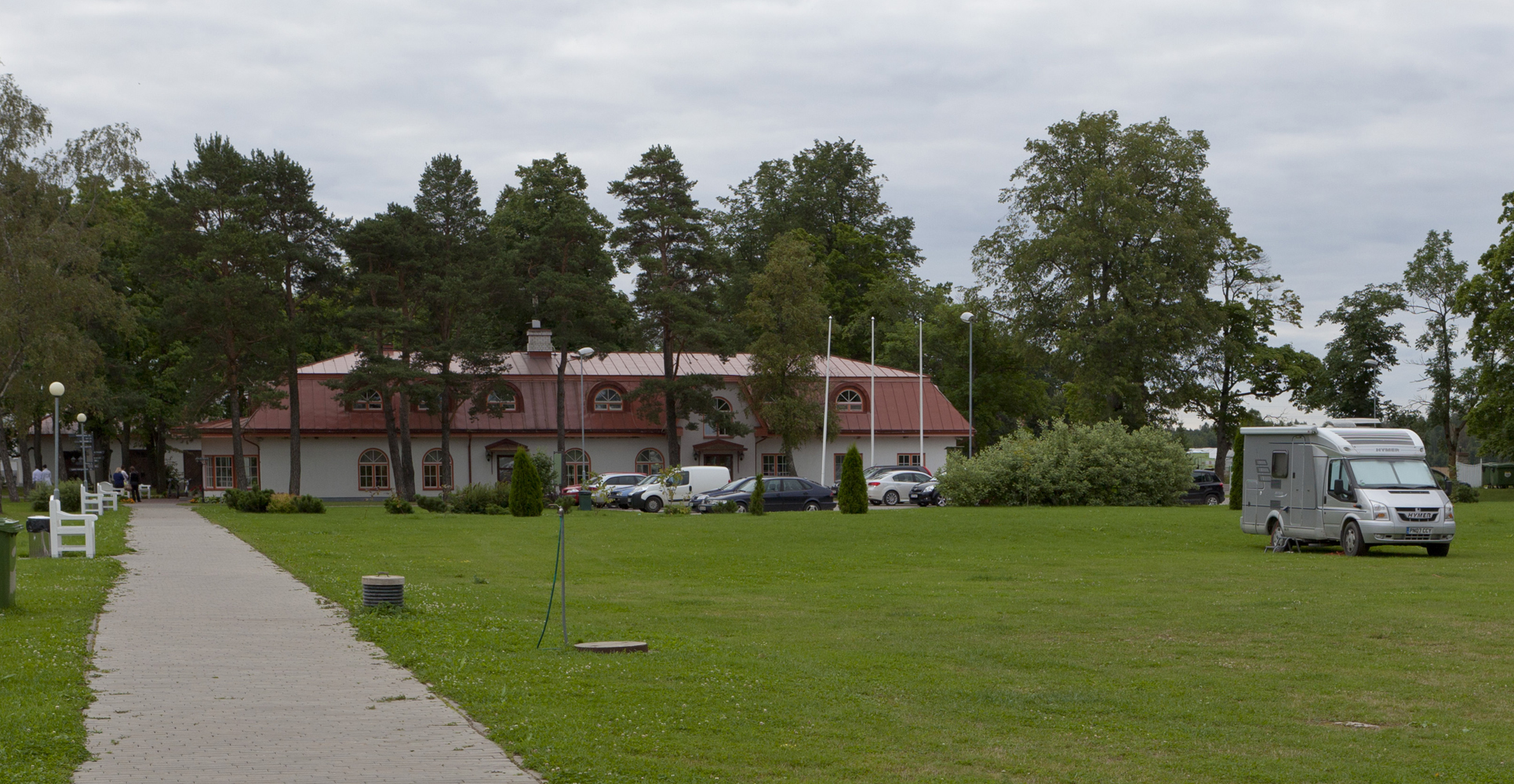 Hotellirakennuksen edustalla on siisti nurmikenttä karavaanareille.