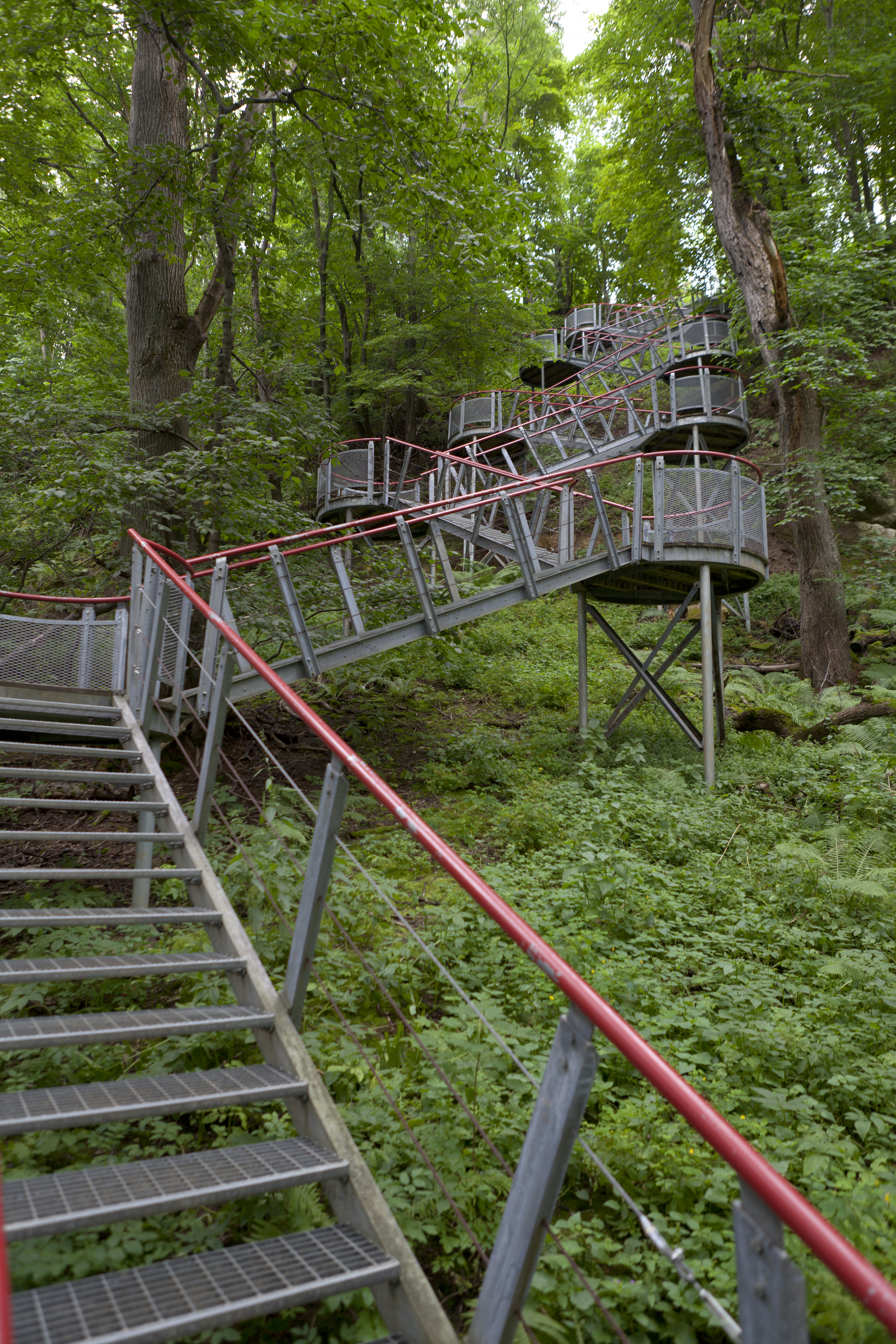 Noin kilometri pohjoiseen noustaan taas jyrkkiä rappusia ylös pienen putouksen reunalla.