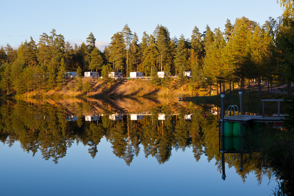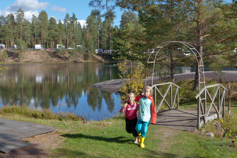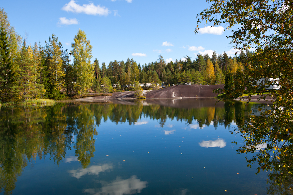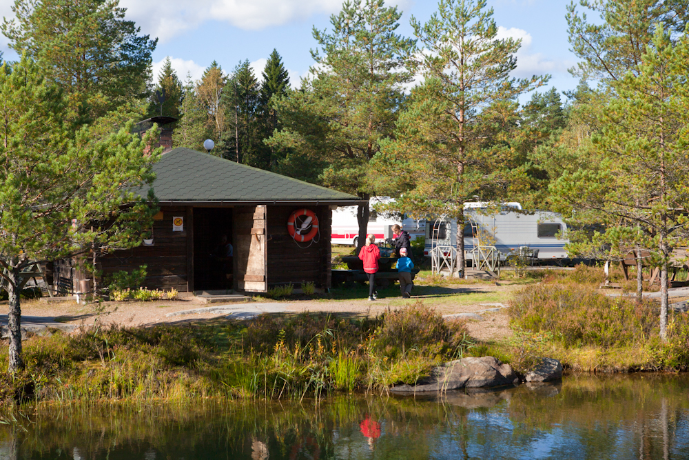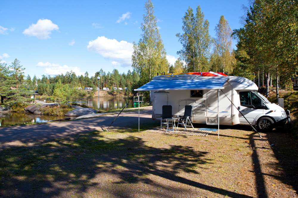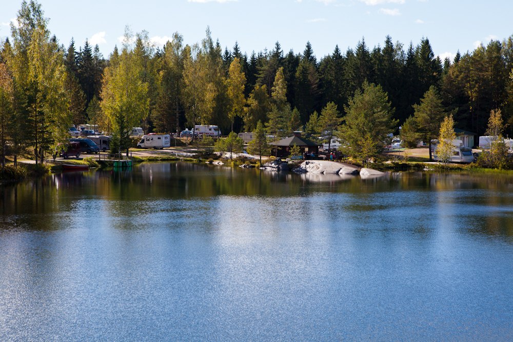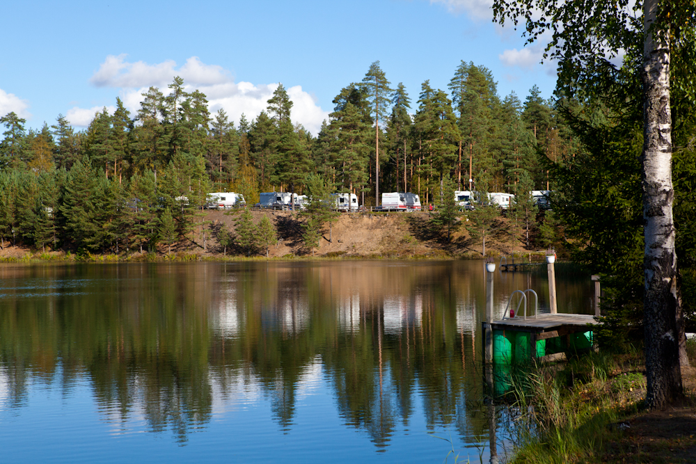 Matkailuajoneuvopaikat on pengerretty ympäri lampea.