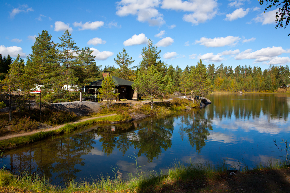 Keskellä lampea pienellä kallioniemellä on grillitupa, ulkogrilli ja ulkopöytä sekä pari keinua.