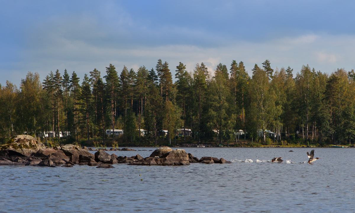Järvellä on runsaasti vesilintuja. Koskelot nousevat pakoon pitkällä nousukiidolla. Isosaaren lahdenpohjukasta lähtee hiljalleen uimaan joutsenperhe, vanhemmat ja kolme poikasta. Kuikkiakin näemme useita.