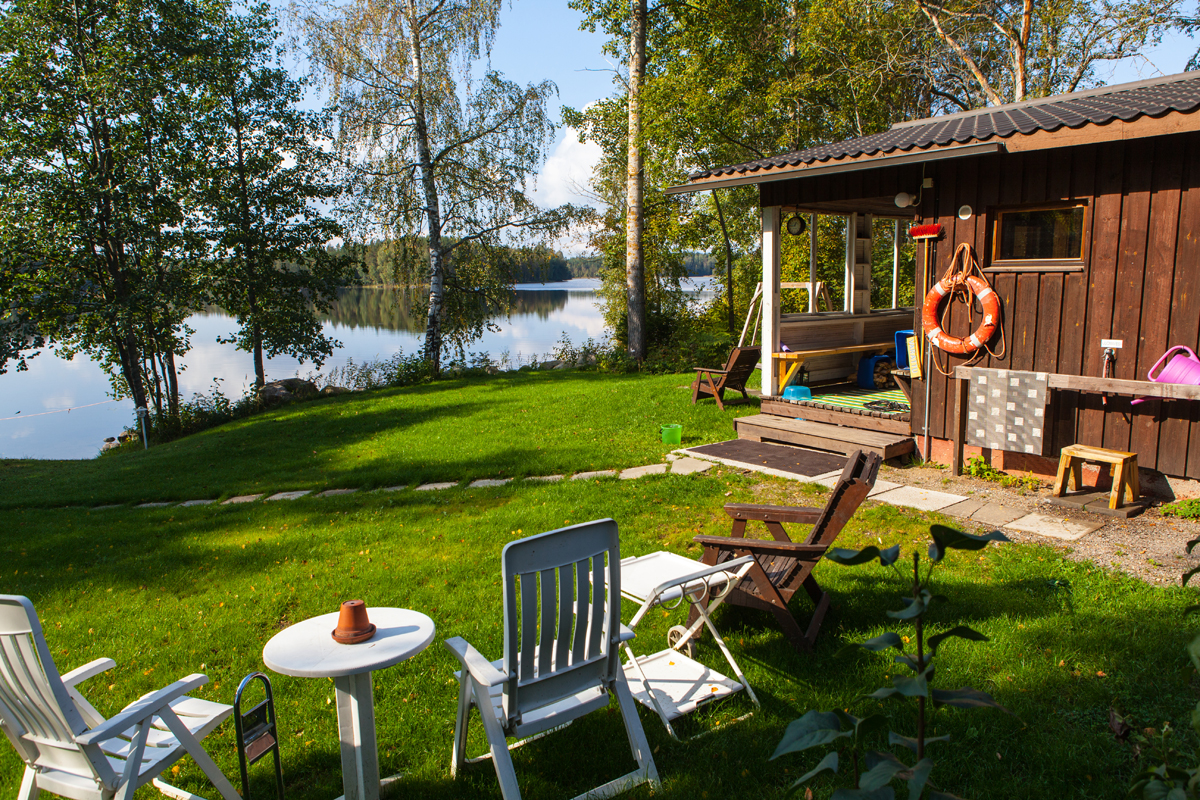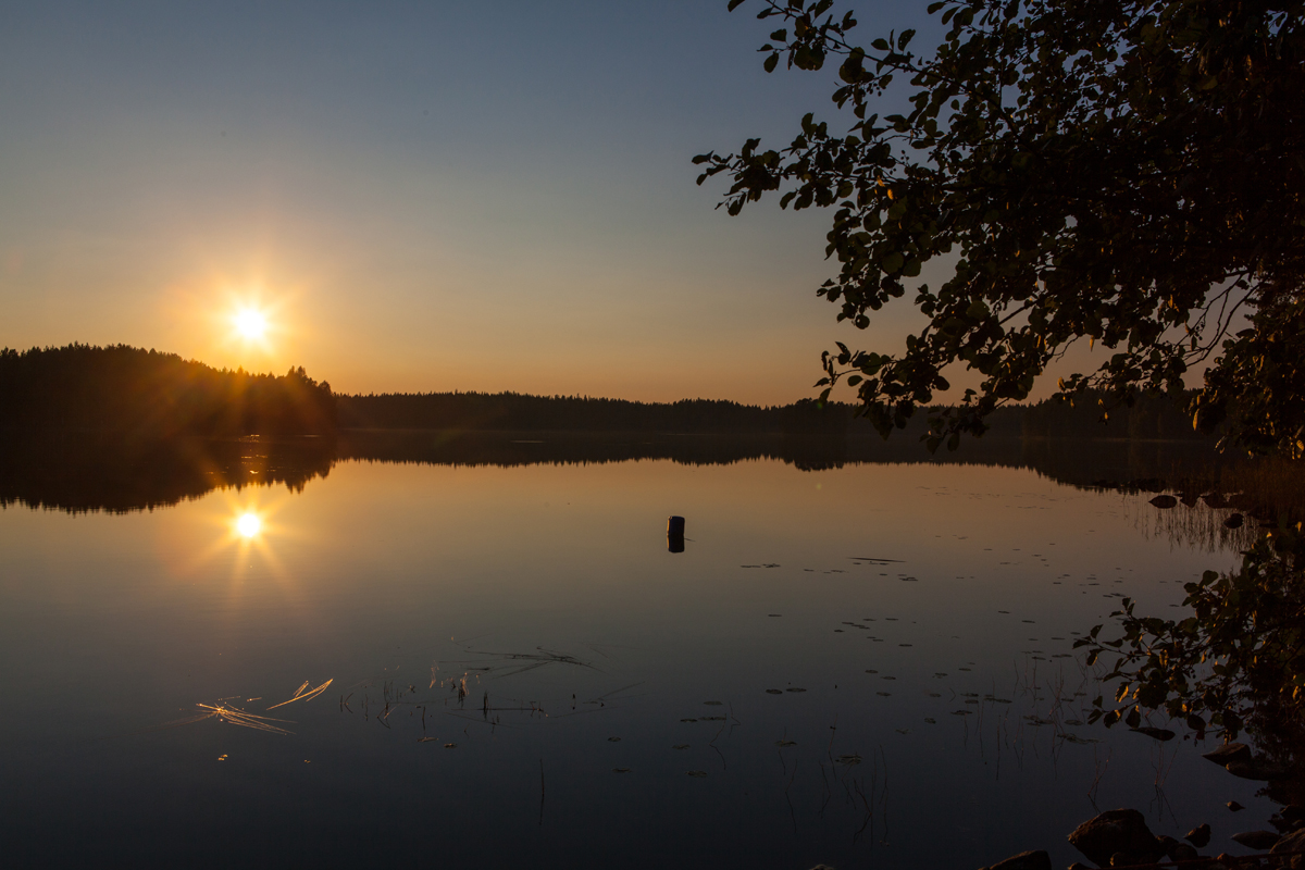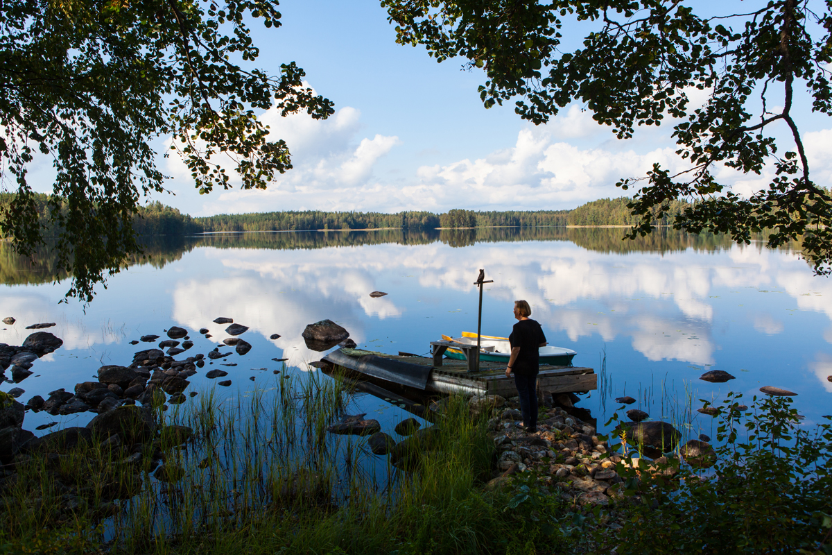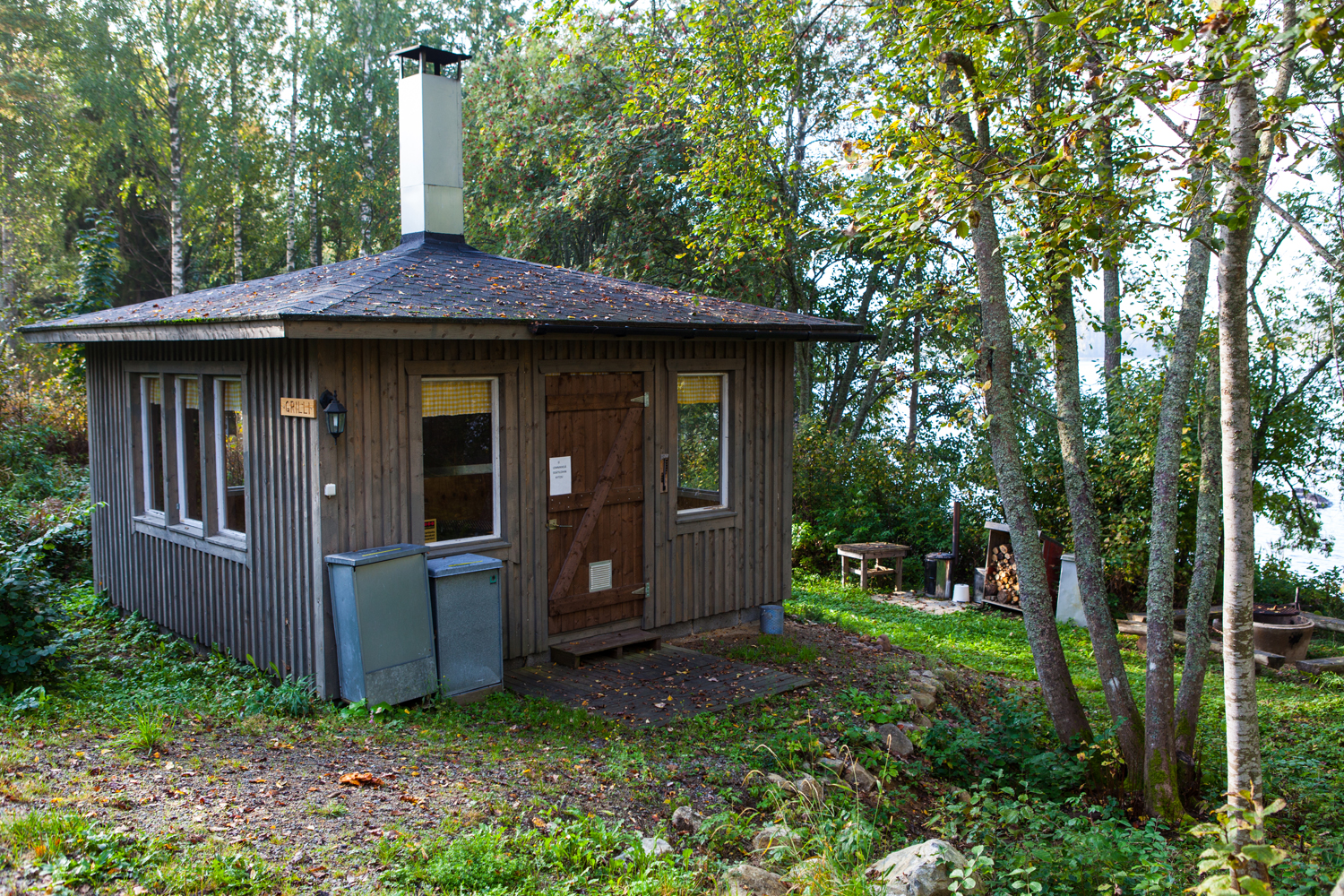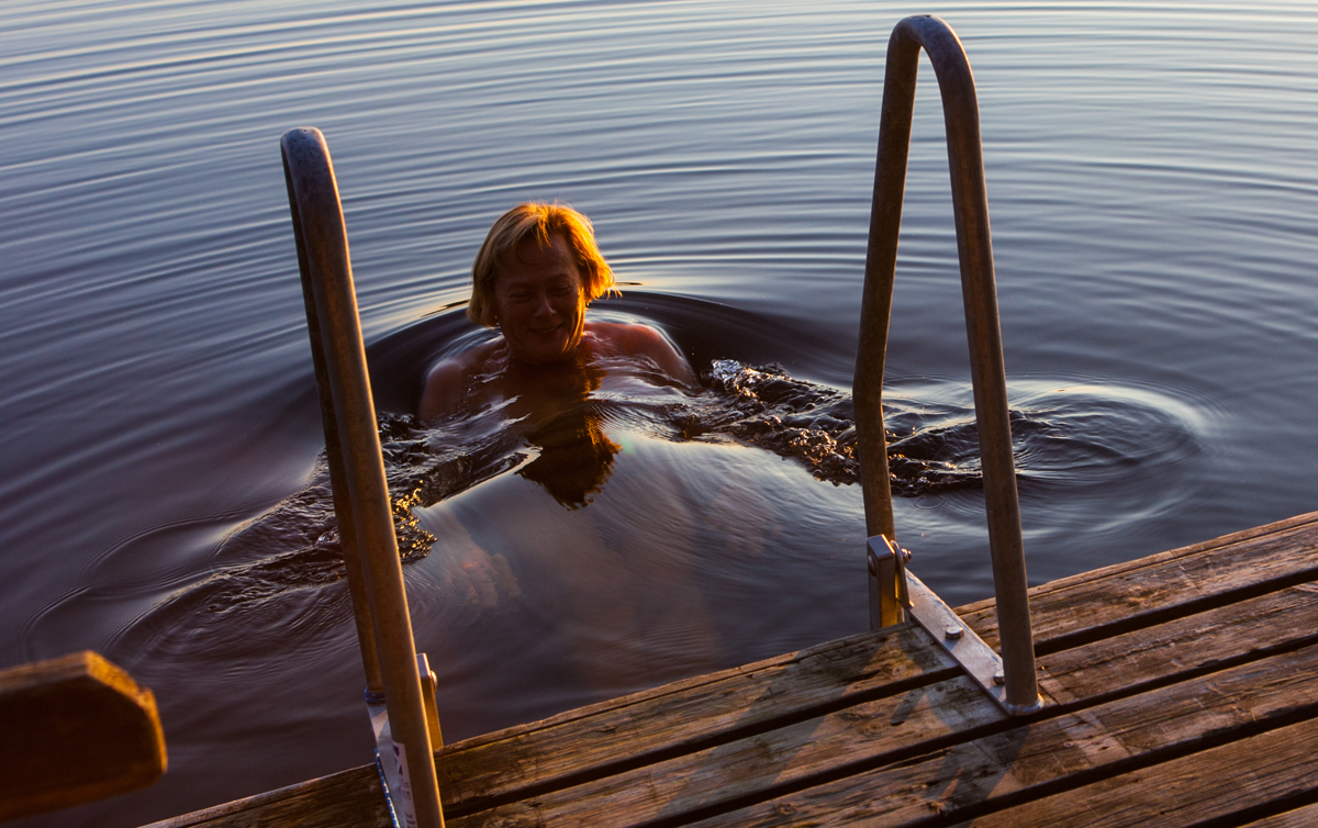 Illalla pääsemme tietysti saunaan. Se lämmitetäänkin täällä joka ilta – aina kun joku on paikalla. Naisilla ja miehillä on oma vuoro ja tarvittaessa lisäksi uikkarisauna ennen ja jälkeen näiden vuorojen. Uinti on aivan mahtavaa lämpimässä järvessä, peilityynen vedenpinnan heijastaessa laskevan auringon punaa. Melkein säälittää rikkoa järven sileä kalvo.