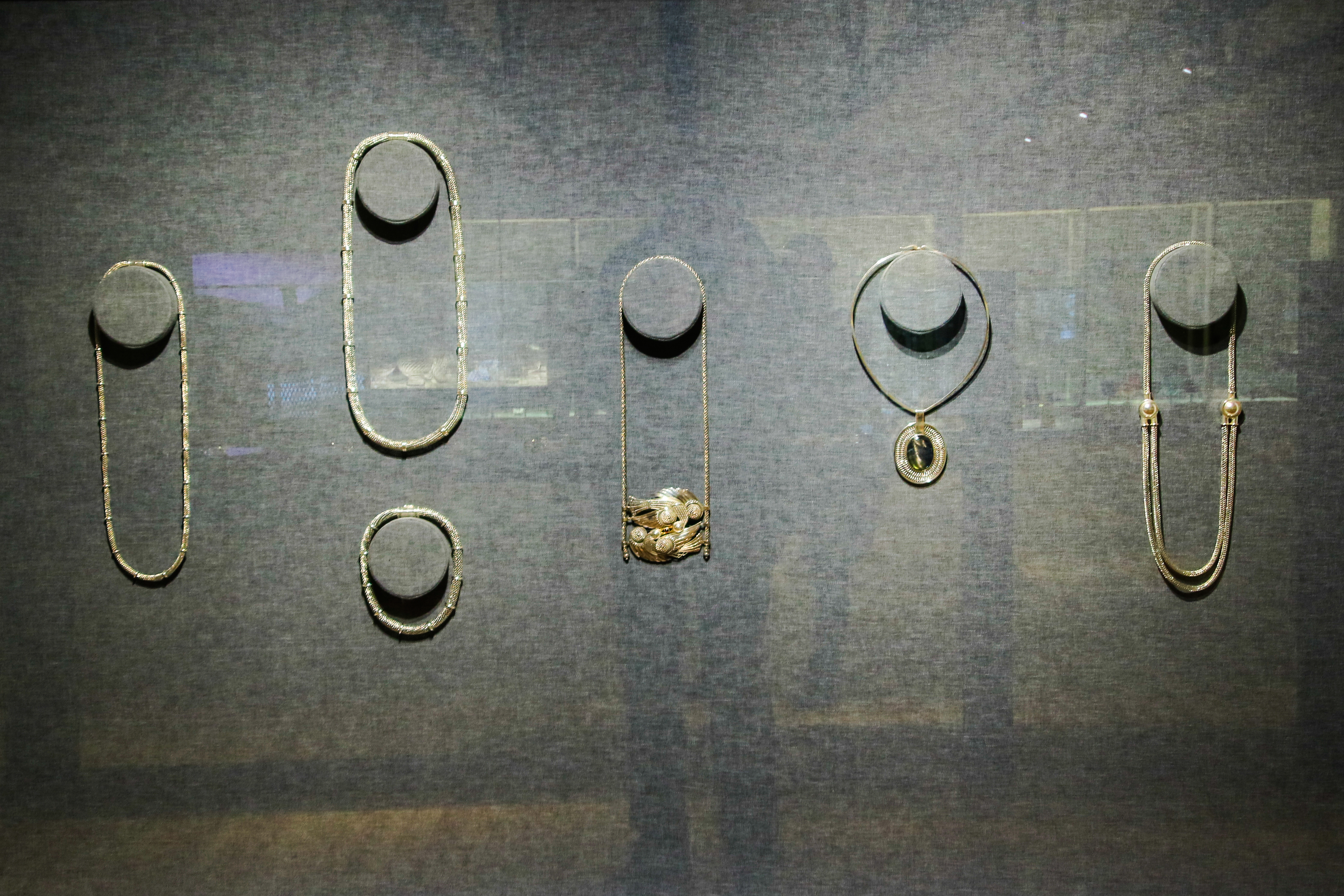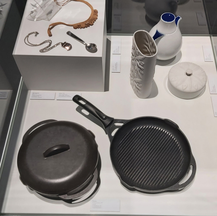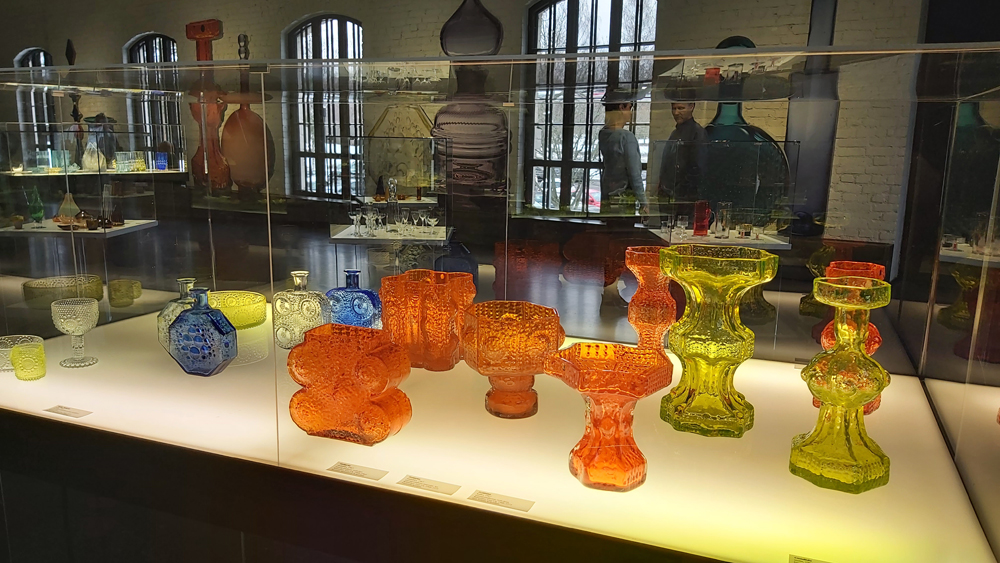 Toisen kerroksen perusnäyttelyssä on suomalaisten huippusuunnittelijoiden taidelasia.