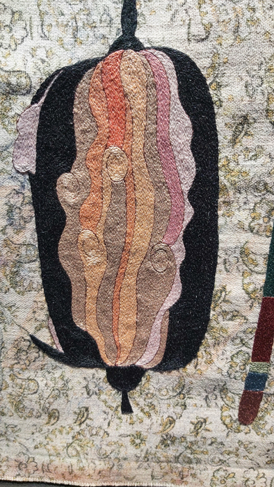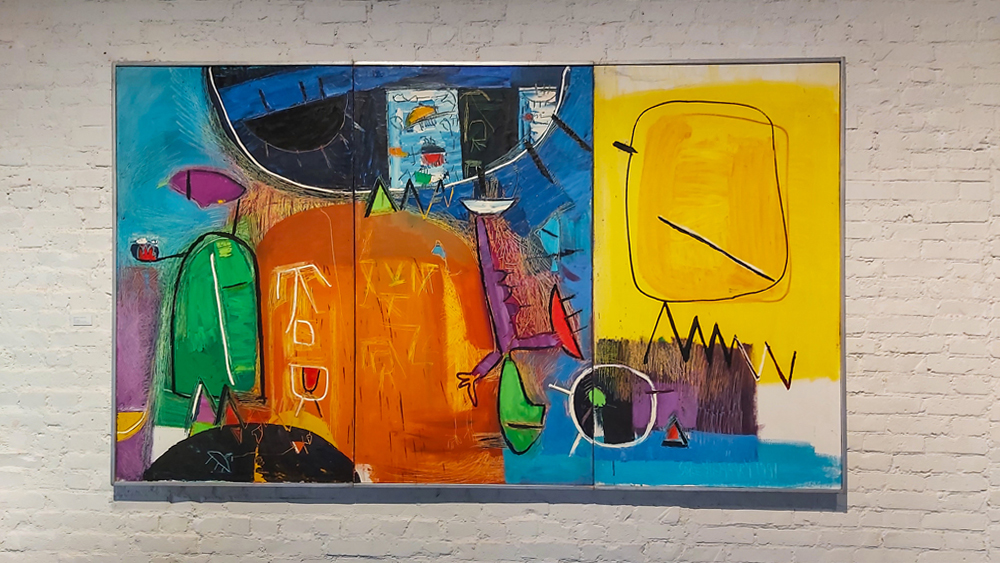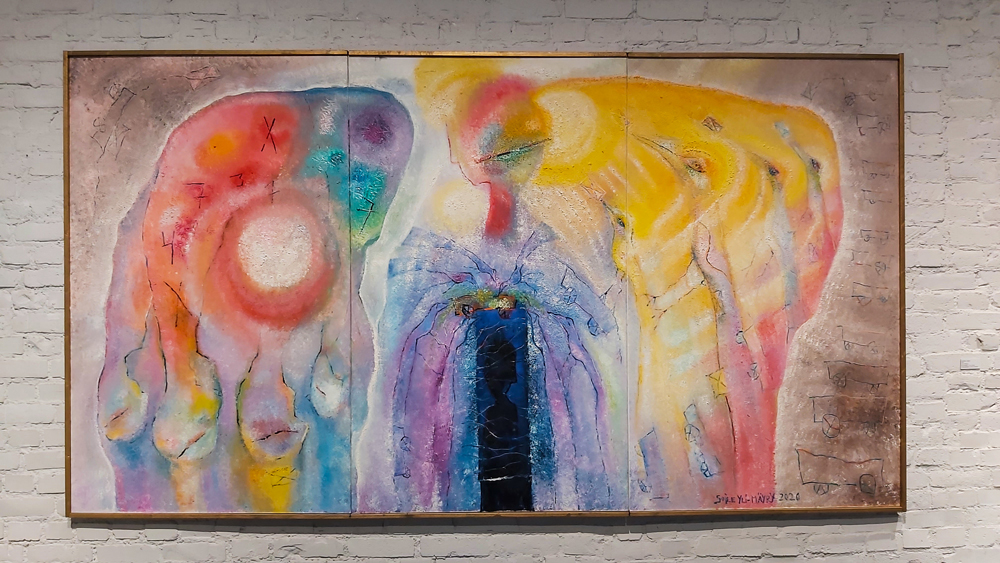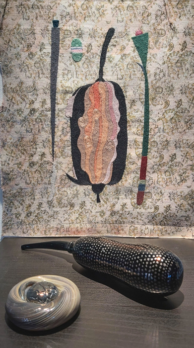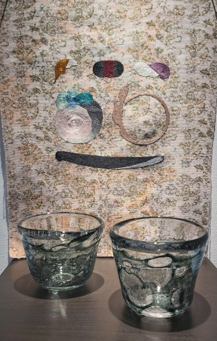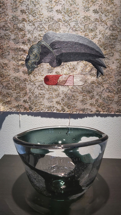 Näyttelyssä on lasiteosten lisäksi maalauksia. Suurella videoruudulla taiteilija kertoo töistään ja niiden taustoista.