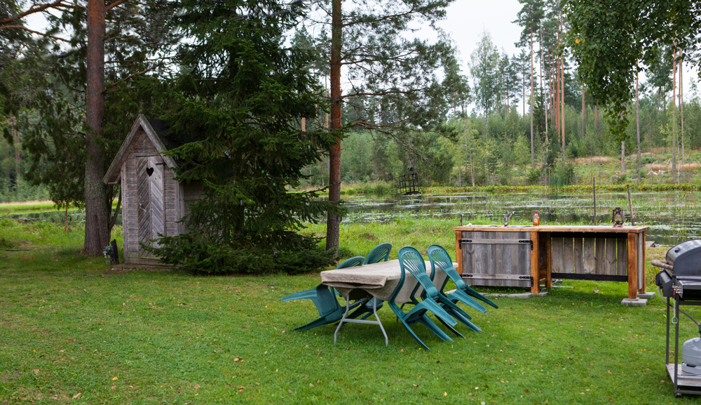 Majoittujien käytössä on myös kahvin- ja vedenkeittimet sekä savustuspönttö ja kaasugrilli, luettelee Kimmo. Pienen matkan päästä metsän siimeksestä löytyy toinen makkaranpaistopaikka, pieni laavu.