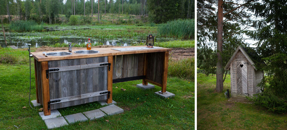 Tiskipaikka on lähellä taaempaa lampea. Vaikka ollaan ulkona paljaan taivaan alla on tiskialtaalla juokseva vesi ja käsisuihku. Lähettyvillä puiden katveessa on siisti ulkovessa. Paikka kemssan tyhjennykseenkin löytyy.