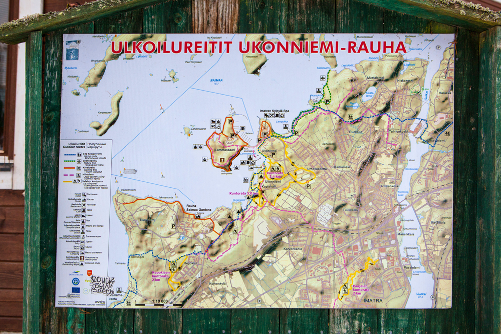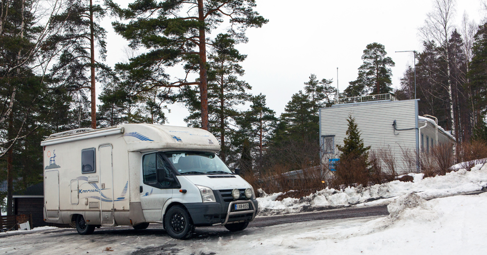 Imatralla ei ole talvisaikaan avoimia leirintäalueita mutta kun ajelemme seitsemisen kilometriä keskustasta luoteeseen, löytyy Saimaan rannalta matkaparkki Ukonlinna.