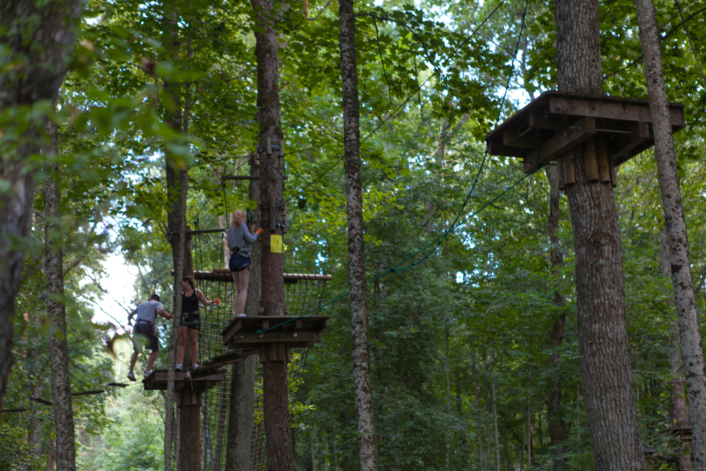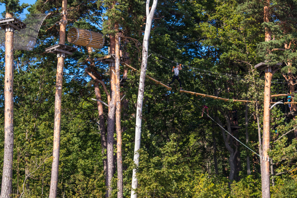 Metsän puissa on pitkä seikkailurata. Pienemmät kiipeilevät parin kolmen metrin korkeudella.