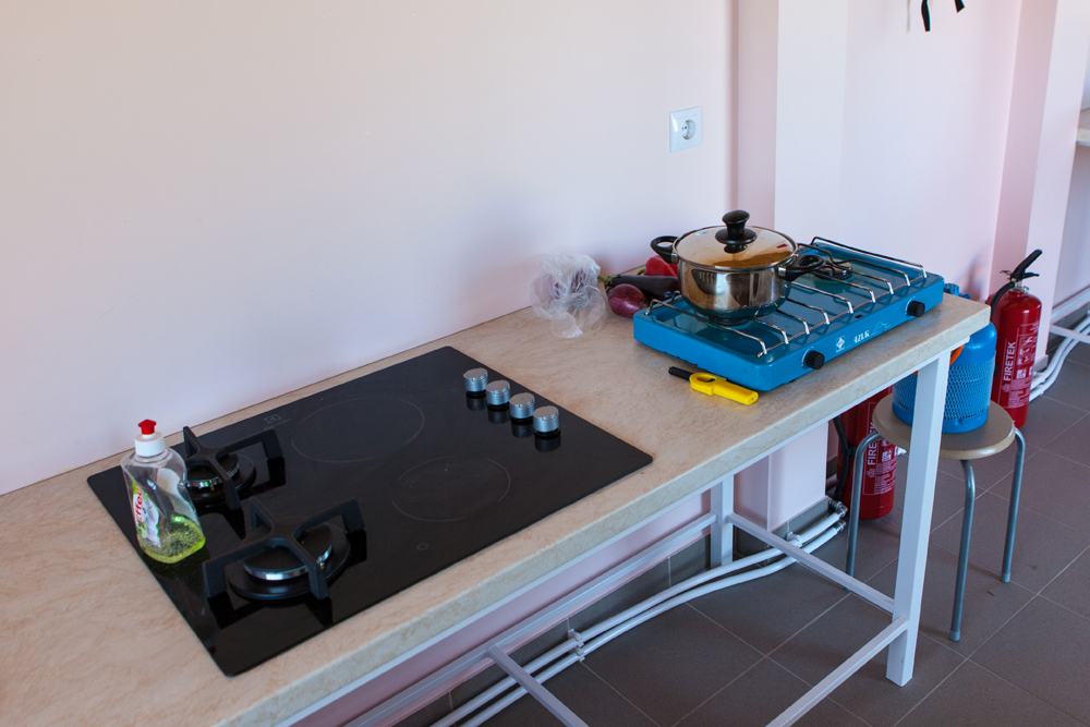 Keittiössä on tiskipöydät ja sähkö- sekä kaasuliesiä sekä pesukone. Kaikki tilat ovat avaria ja siistejä.