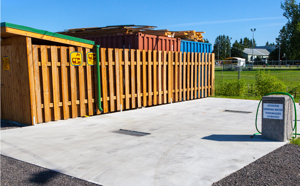 Vieressä on roskakatos lajitteluastioineen, moderni kemssantyhjennyspaikka sekä ajokaivo ja makeanvedenletkut.