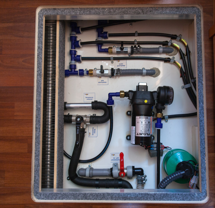 Auton putkiliitokset, vesipumput ja hanat on keskitetty yhteen paikkaan lattialuukun alle. Kaikki muutkin laitteet ovat luukkujen takan helposti tavoitettavissa. Huolto, tyhjennys ja tarkistus on helppoa.