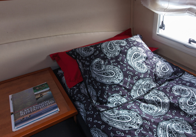 Pieni jääkaappi on sekin venekäyttöön tarkoitettu. Waeco Coolmatic toimii 12 tai 24 voltilla. Tiskin alla ja vieressä on laatikostoja ja kaappeja. Ne ovat kovaa käyttöä silmälläpitäen tukevampaa tekoa kuin matkailuajoneuvoissa yleensä.