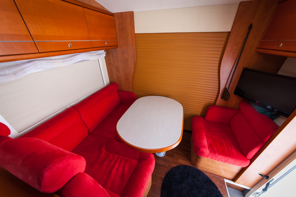 Siinä on edessä pöytäryhmä, jossa on oikealla mukava nojatuoli ja vasemmalla L-sohva. Sen verran metsästysautossa on annettu vaimolle periksi että sohvien verhoilu on voimakkaan punainen, kertoo Antti. Ohjaamon istuimet eivät käänny asumiskäyttöön. Ohjaamon lattia on selvästi alempana johtuen asuinosan kaksoispohjasta.