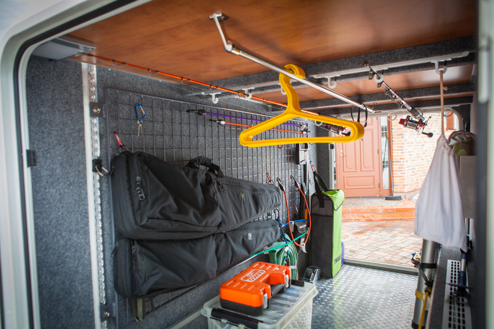 Perässä on suuri takatalli, jossa on paikat harrastusvälineille. Tallin katossa on telineet vavoille. Peräseinällä on teräsristikko, johon kiinnitetään asepusseja ja muita tarvikkeita.